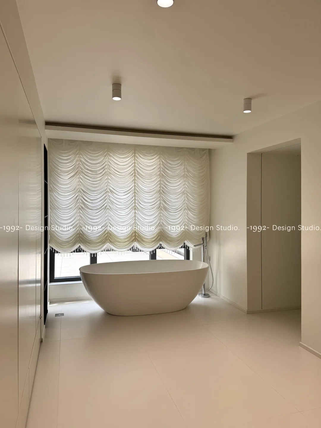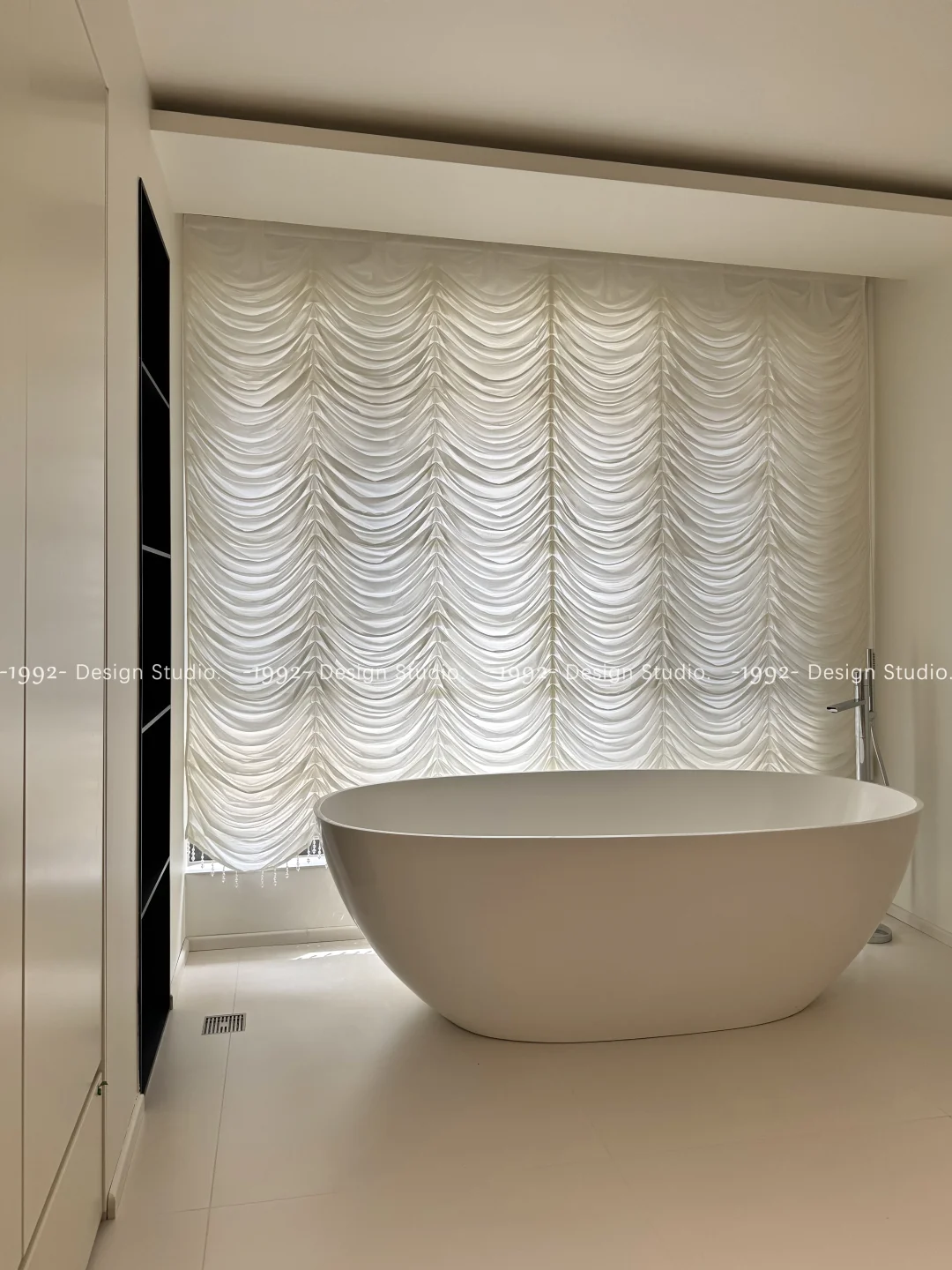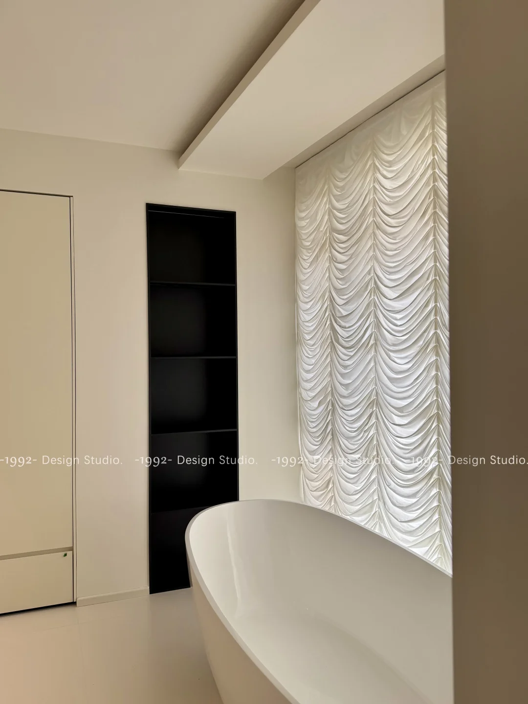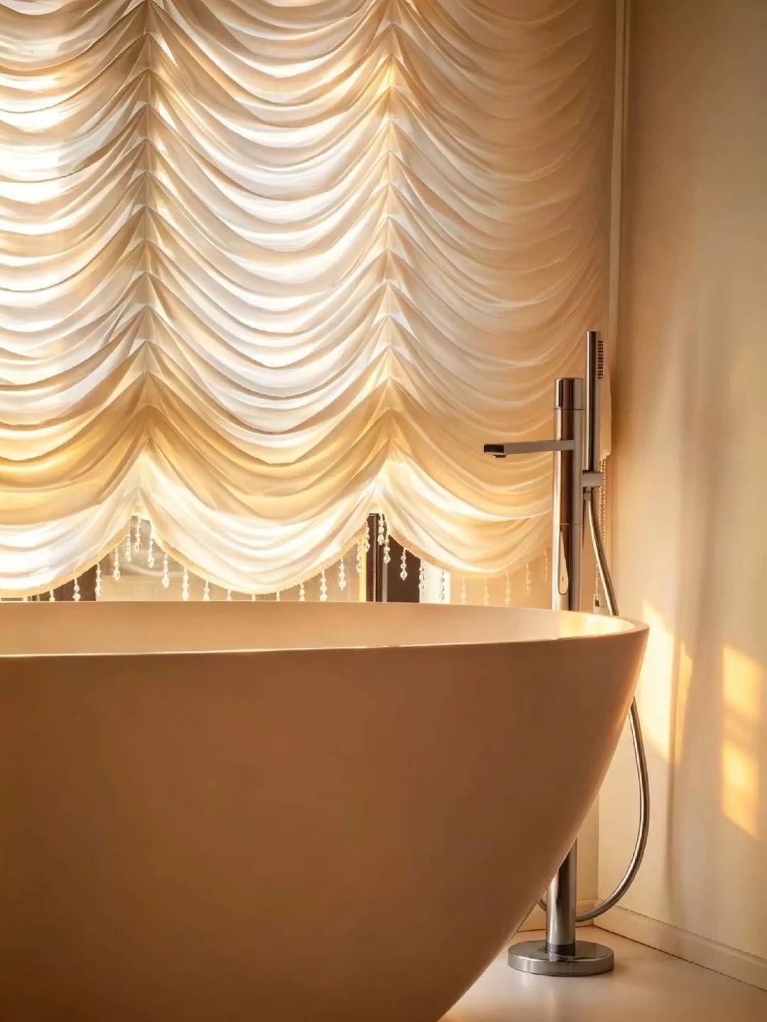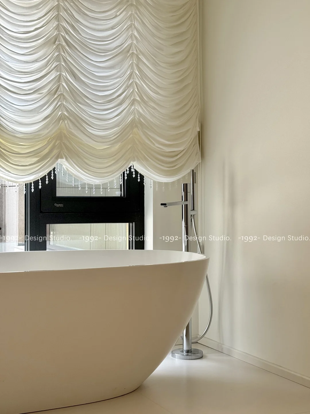 敢放在浴缸前,它的遮挡隐私效果还是可以的,白天的时候阳光照在上面,给你满满的松弛感