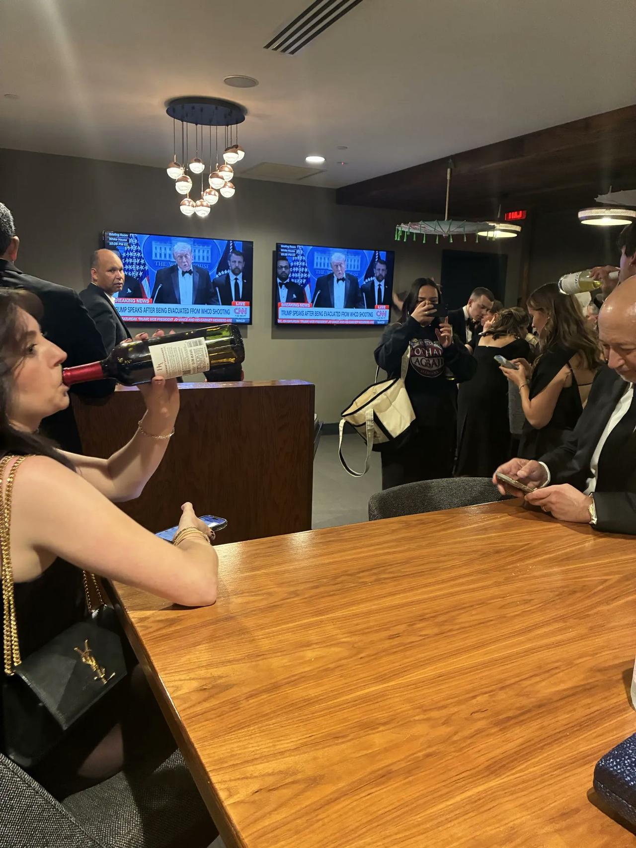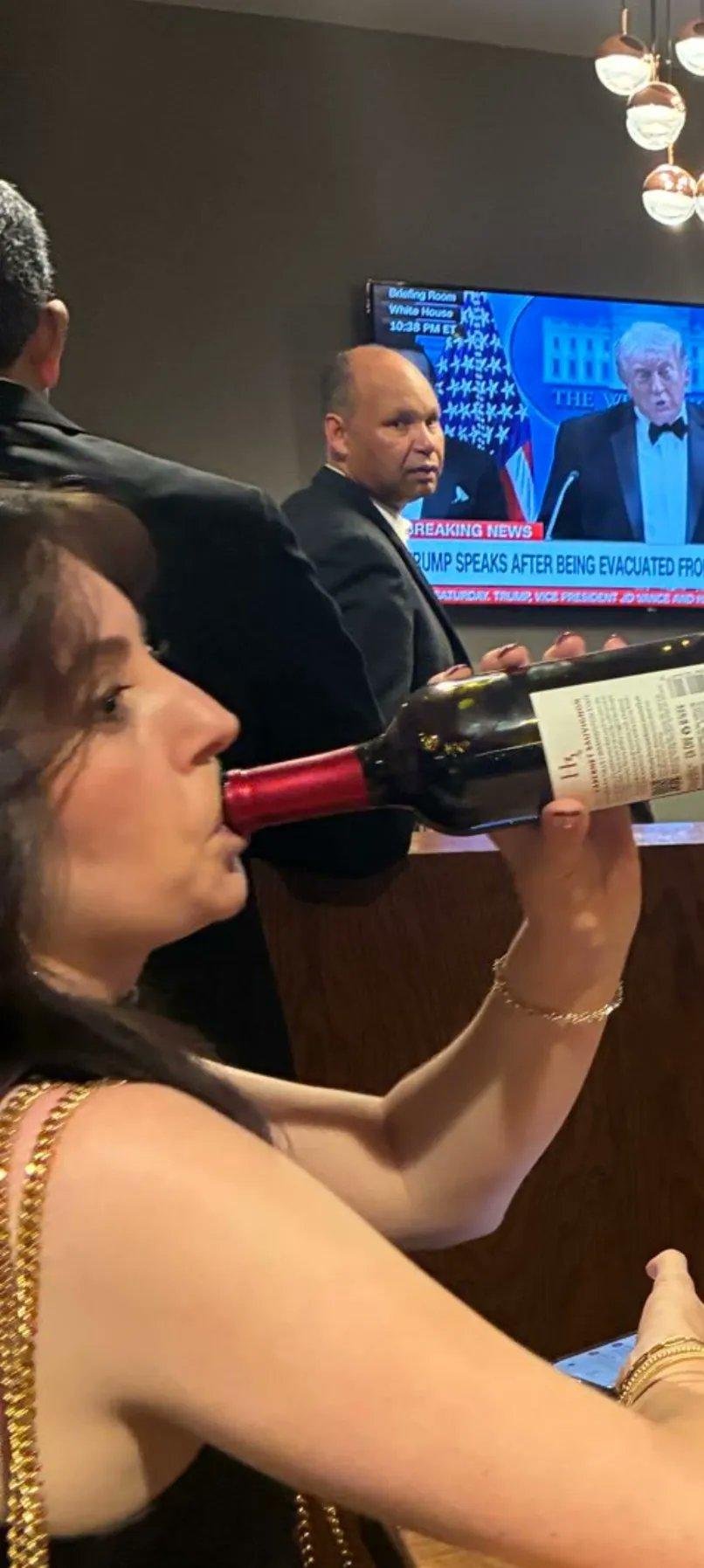 在白宫记者晚宴枪击事件发生后,人们逃离现场时,有人顺手牵羊地拿起了整瓶整瓶的酒。2026年4月25日白宫记者晚宴的照片,照片显示,在枪声响起后,衣着光鲜的宾客们惊慌失措地直接对瓶子吹起,畅饮红葡萄酒和白葡萄酒。