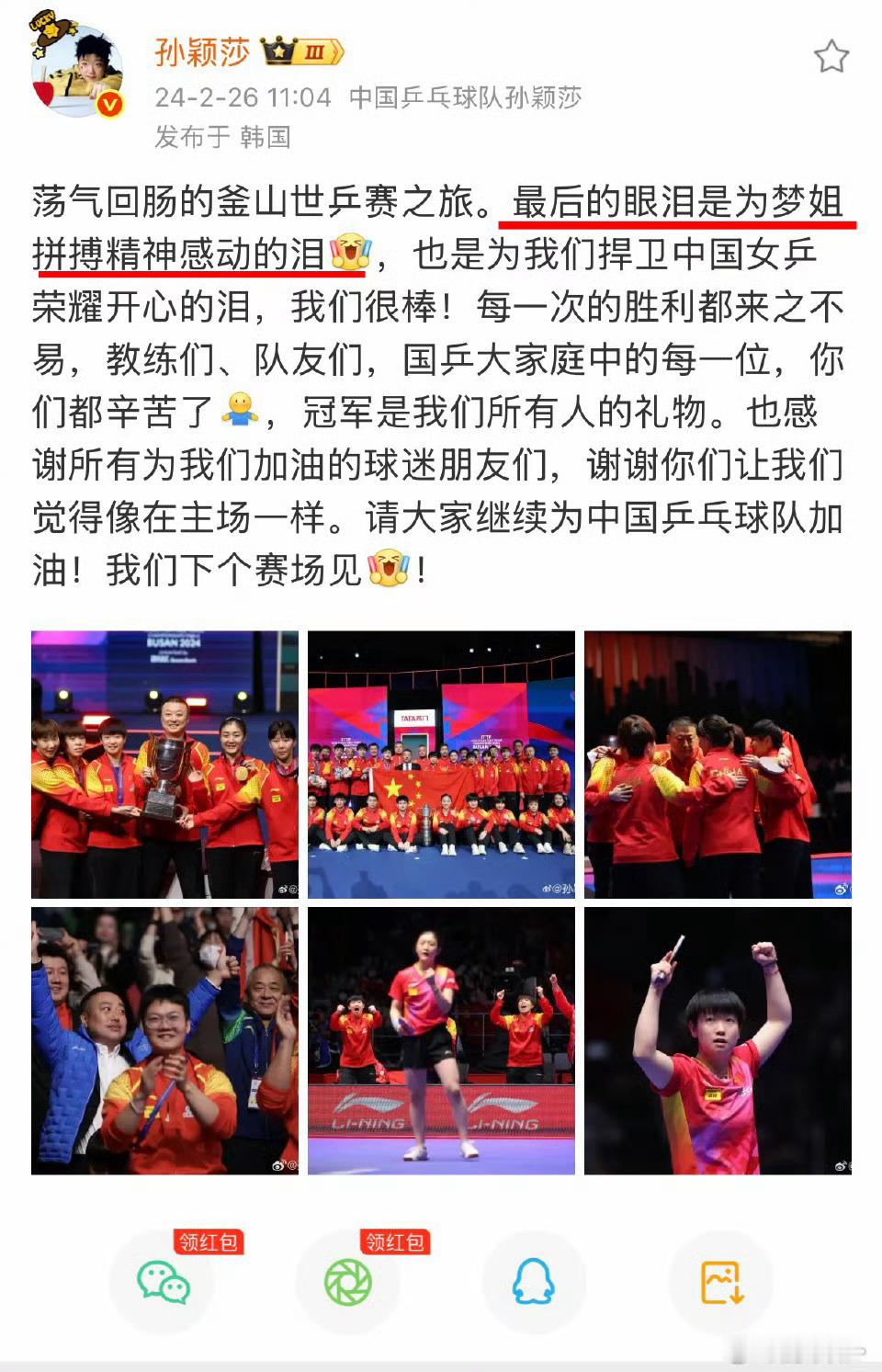 孙颖莎 20岁的孙颖莎在东京奥运会混双失利后顶住舆论重压挺身而出,半决赛零封伊藤浇灭东道主嚣张气焰,其中第二局3—9后霸气连拿八分逆转,也彻底扭转了整个球队气势的时候。陈梦队医:你已赢得人生中最重要的比赛,可以输给陈梦了。 24岁的孙颖莎在釜山世乒赛力挽狂澜为陈梦创造了救赎自己的条件,为祖国为团队流泪。一颗赤子之心无愧于团队无愧于任何人陈梦