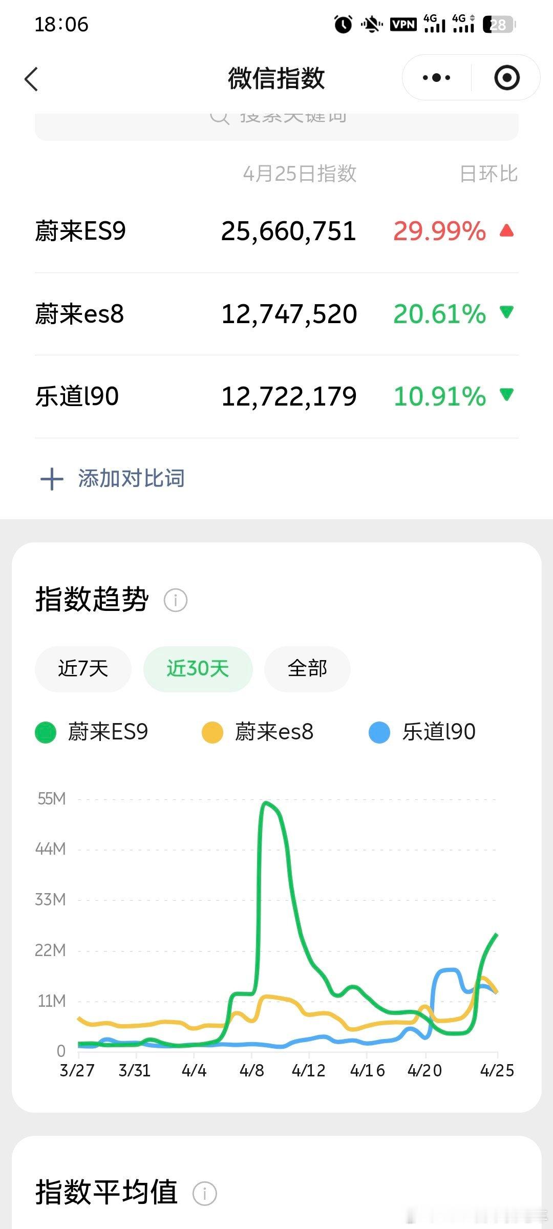 ES9和ES8的微信指数真的是同频共振的,而乐道L90的搜索指数也不错