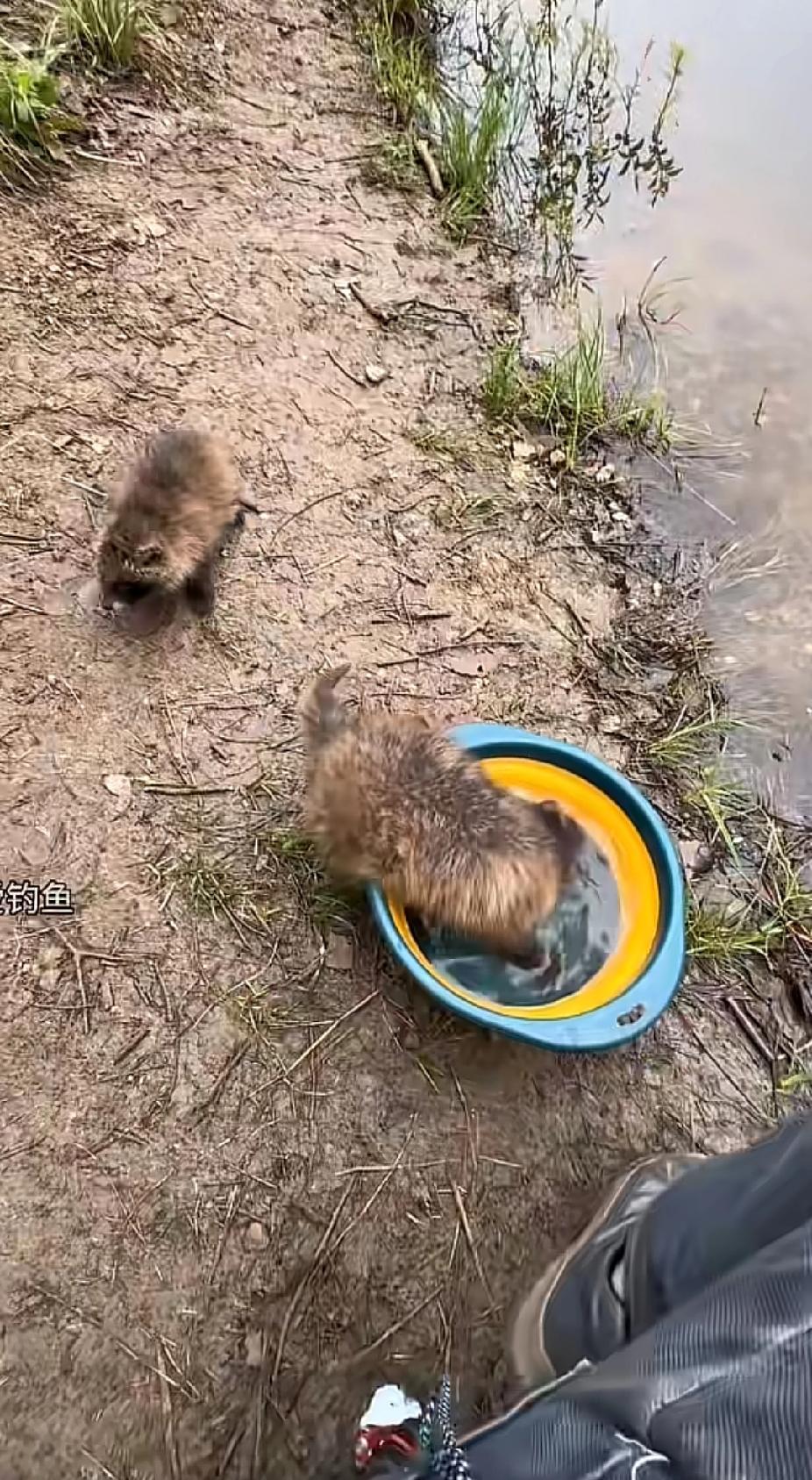 而让钓鱼男子惊讶的是,这两只小动物,跑到钓鱼男子的钓盆旁后,竟然旁若无人地跳进钓盆里,抓起钓鱼男子放在钓盆里的鱼来。