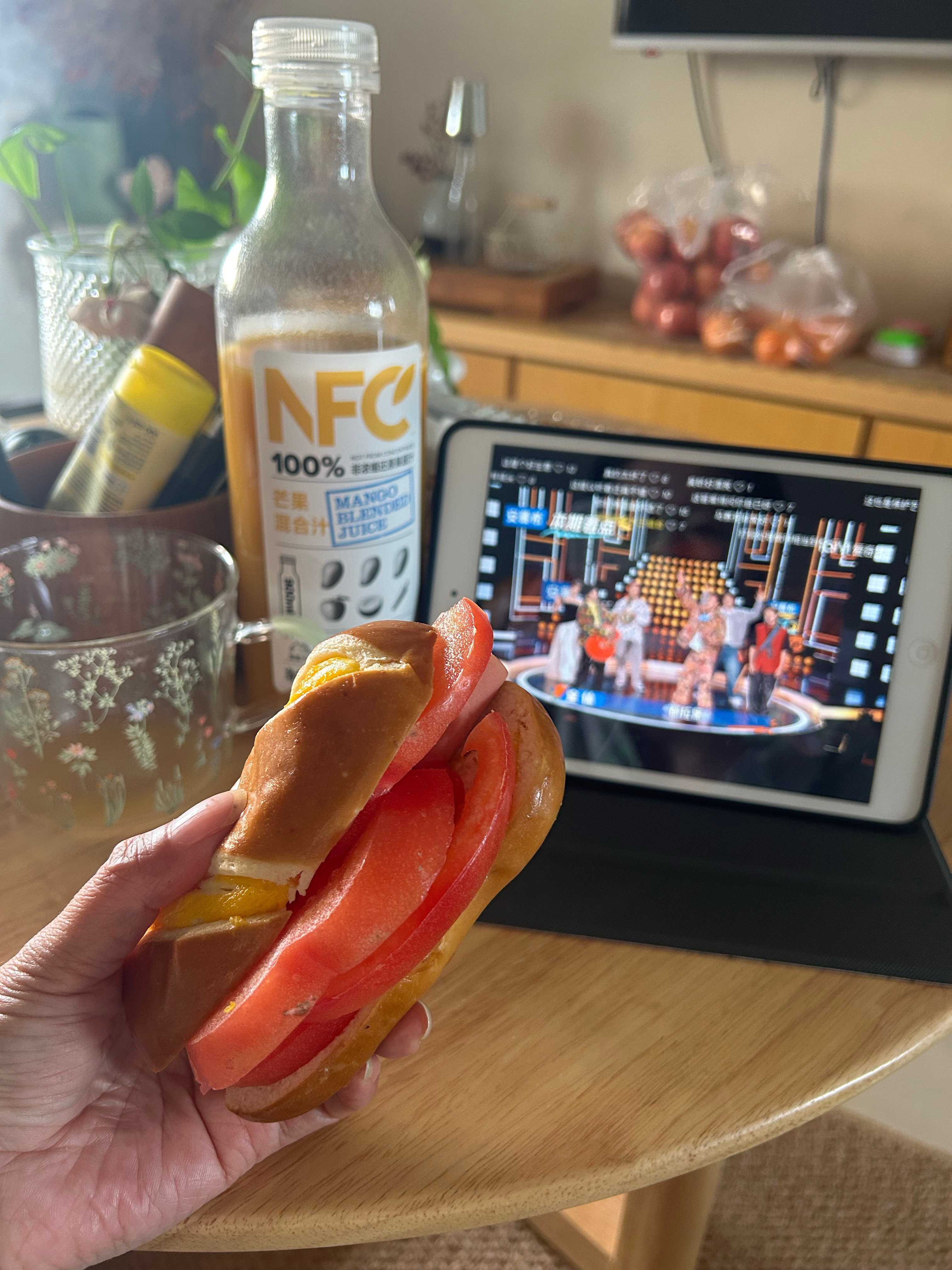 周日快乐风铃开得争先恐后的发现紫色的比粉色的好看今天的早午餐喝了昨天晚上剩的燕麦粥炒了一盘鸡蛋西红柿就花卷我感觉偶尔还是得吃点正常的人饭要不然会疯的小妞几乎也天天做饭各种王婆卖瓜自卖自夸半下午吃了一个自制的小汉堡喝了不少果汁终于抽出时间看了几个小时脱口秀最近几乎都没看过综艺也不知道忙的是啥这个时间挤挤还是有的某人去渑池还没回来我先去遛狗回来再给他弄饭