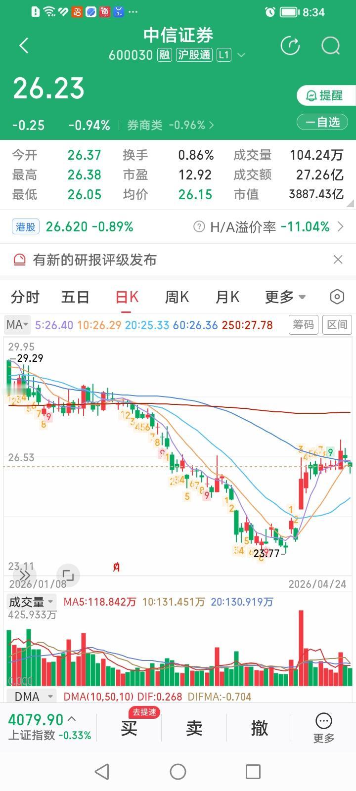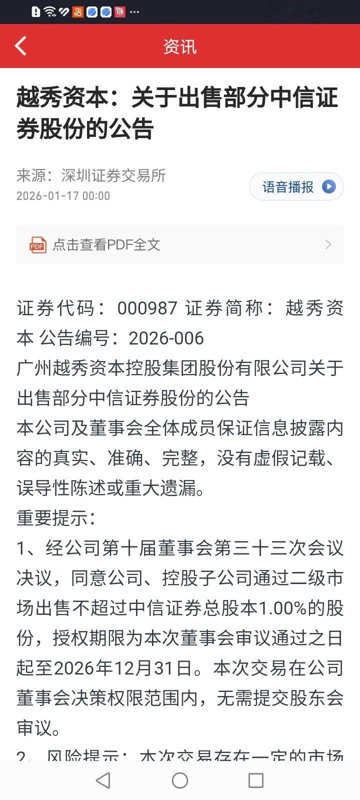 实在搞不懂越秀资本葫芦里到底卖的什么药!2024、2026年两次公告要减持中信证券,但就是没动静。你说奇怪不奇怪,越秀资本在2024年11月13号公告要出售中信证券1%股份后,2025年一年多来没有实施出售计划。到2026年1月17日又发一次减持中信证券的公告,到这次一季报披露仍旧一股也没出售。越秀资本到底唱的是哪一出啊?