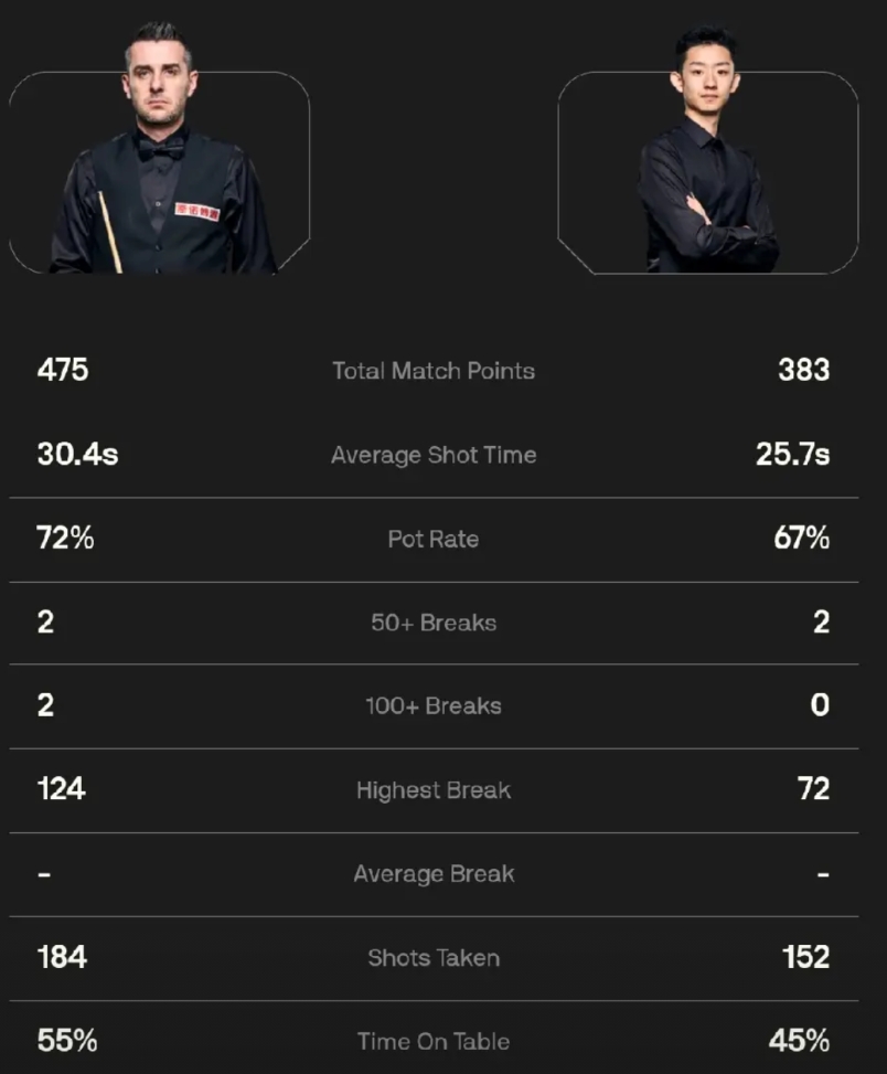 塞尔比 4-4 吴宜泽 这场世锦赛正赛第二轮的比赛没有悬念!开局塞尔比单杆123、124分,2-0,吴宜泽连扳3局,3-2领先。 塞尔比单杆81分扳平比分,吴宜泽单杆72分反超比分4-3领先! 塞尔比单杆65分拿下第八局,4-4战平。