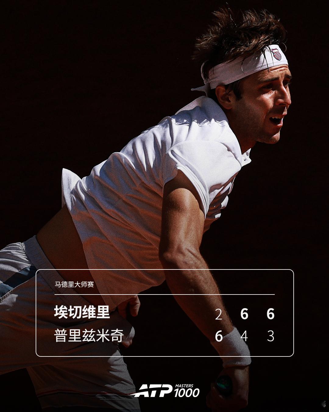 ATP1000 马德里大师赛第三轮,埃切维里鏖战三盘,以2-6 6-4 6-3逆转资格赛选手普里兹米奇,晋级第四轮。下一轮,他的对手是菲斯和纳瓦之间的胜者。