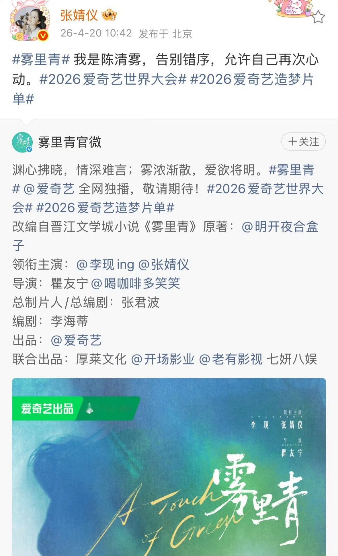 李现张婧仪出发进组雾里青我将狠狠拥护这个《雾里青》,期待开机李现张婧仪雾里青进组