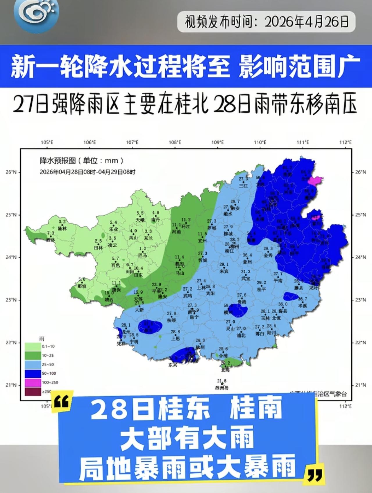 对比今年4月17~22日的降水过程,本轮强度稍弱,但影响范围更广。桂林、柳州、河池山市北部强降雨区域重叠,山洪地质灾害和城乡治涝等风险较高,需加强防范。同时还需防范啊雷暴、大风、冰雹等强对流天气对交通运输、农业生产、户外活动的不利影响。 广西 天气 天气预报
