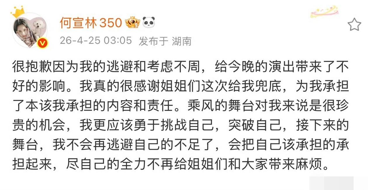 何宣林看了网友的评论,凌晨发文道歉,承认自己逃避了本该她承担的责任,说实话唐艺昕确实替她抗下了本该她出丑的雷。