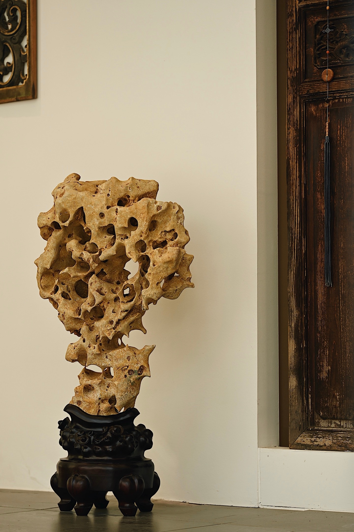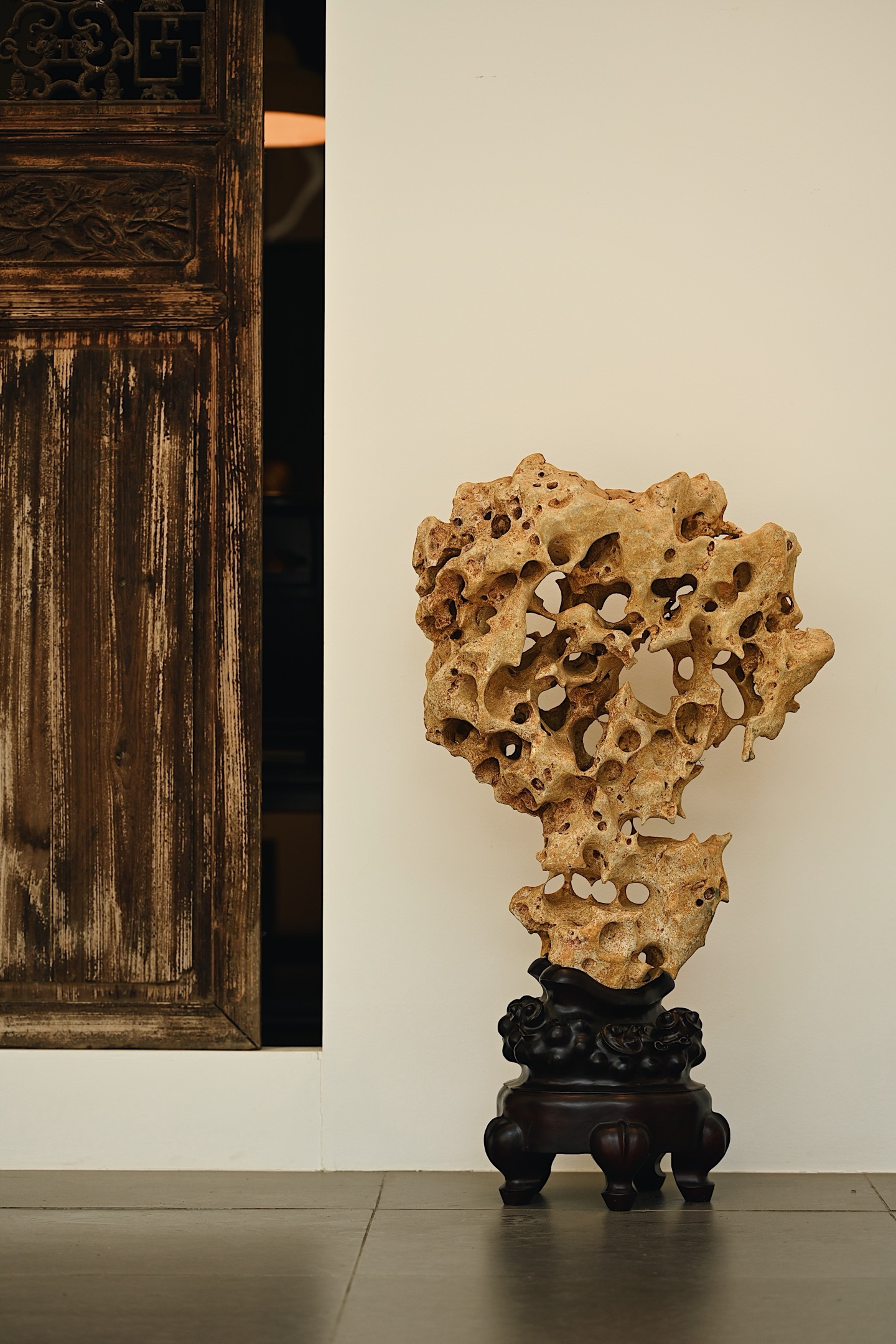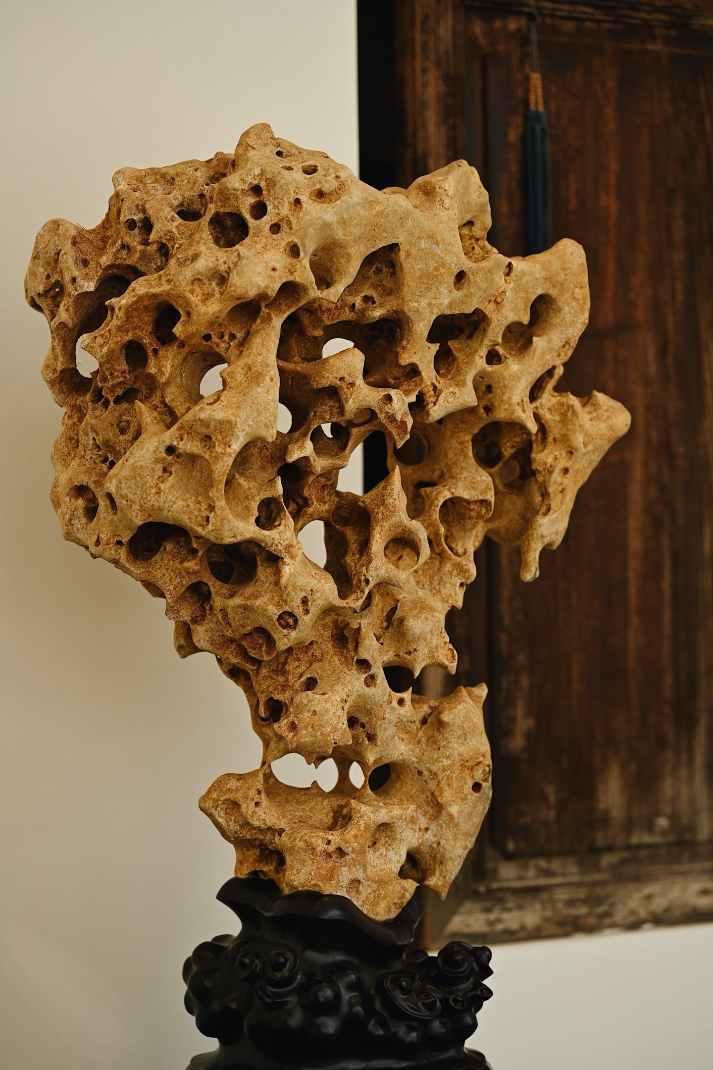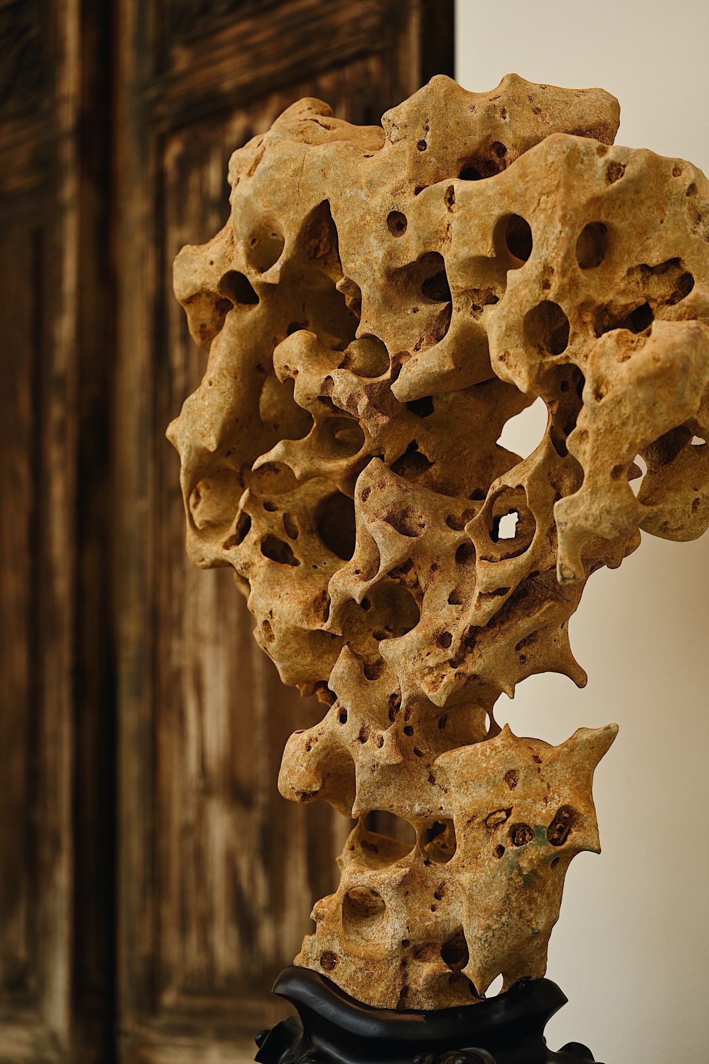 体型较大,石体孔洞密布,大小不一,连环贯通,尽显“透漏”之妙;石面纹理褶皱层叠,苍劲古拙,兼具“瘦皱”之姿。整体气韵苍古,形若峰峦,又似云气,置诸案头,咫尺间尽揽山水之趣。