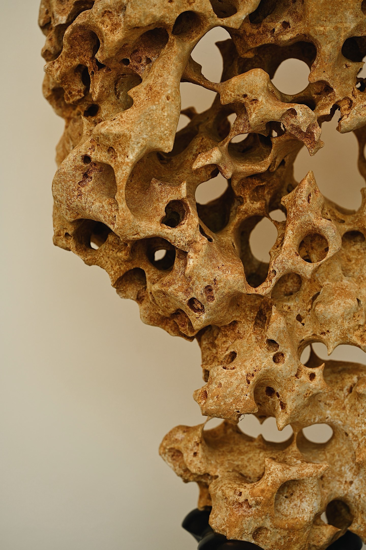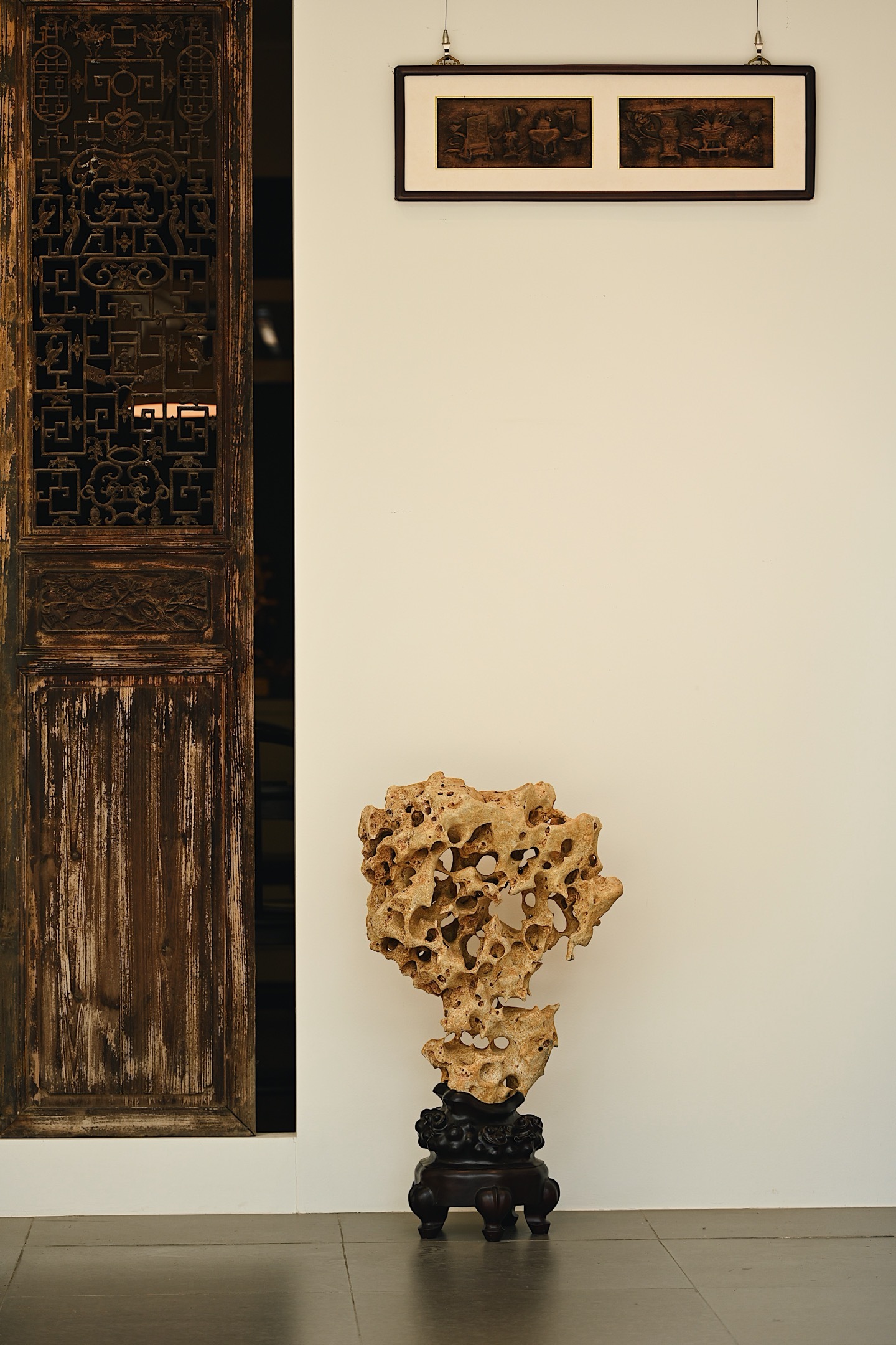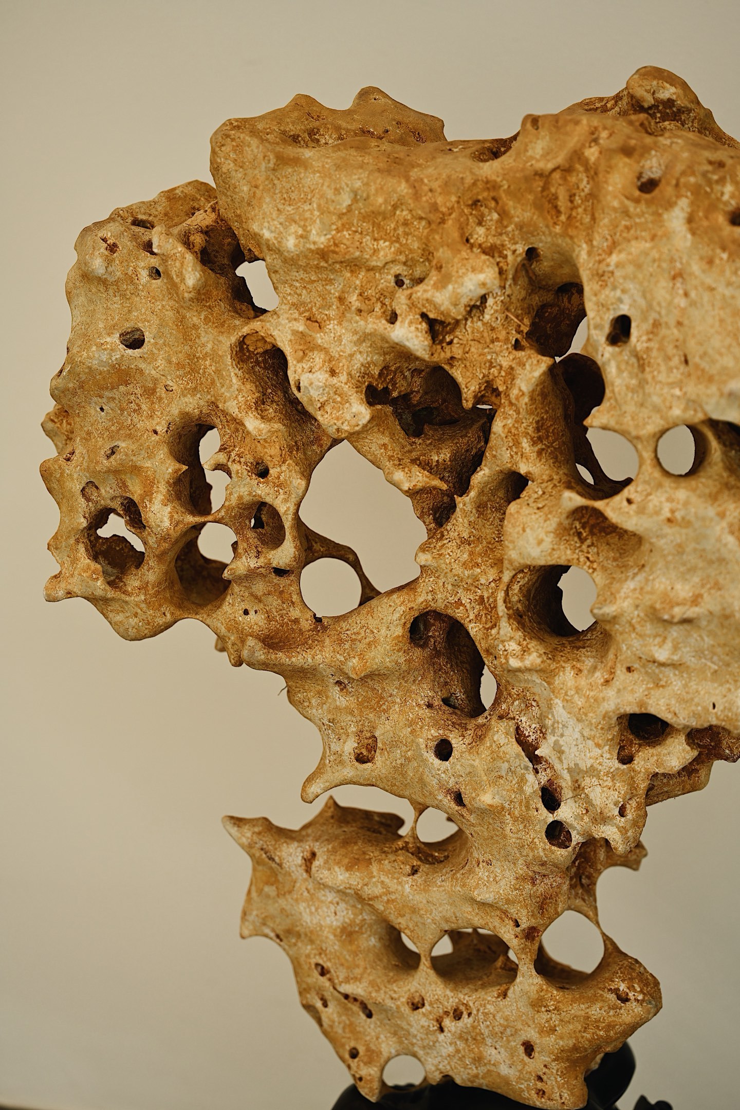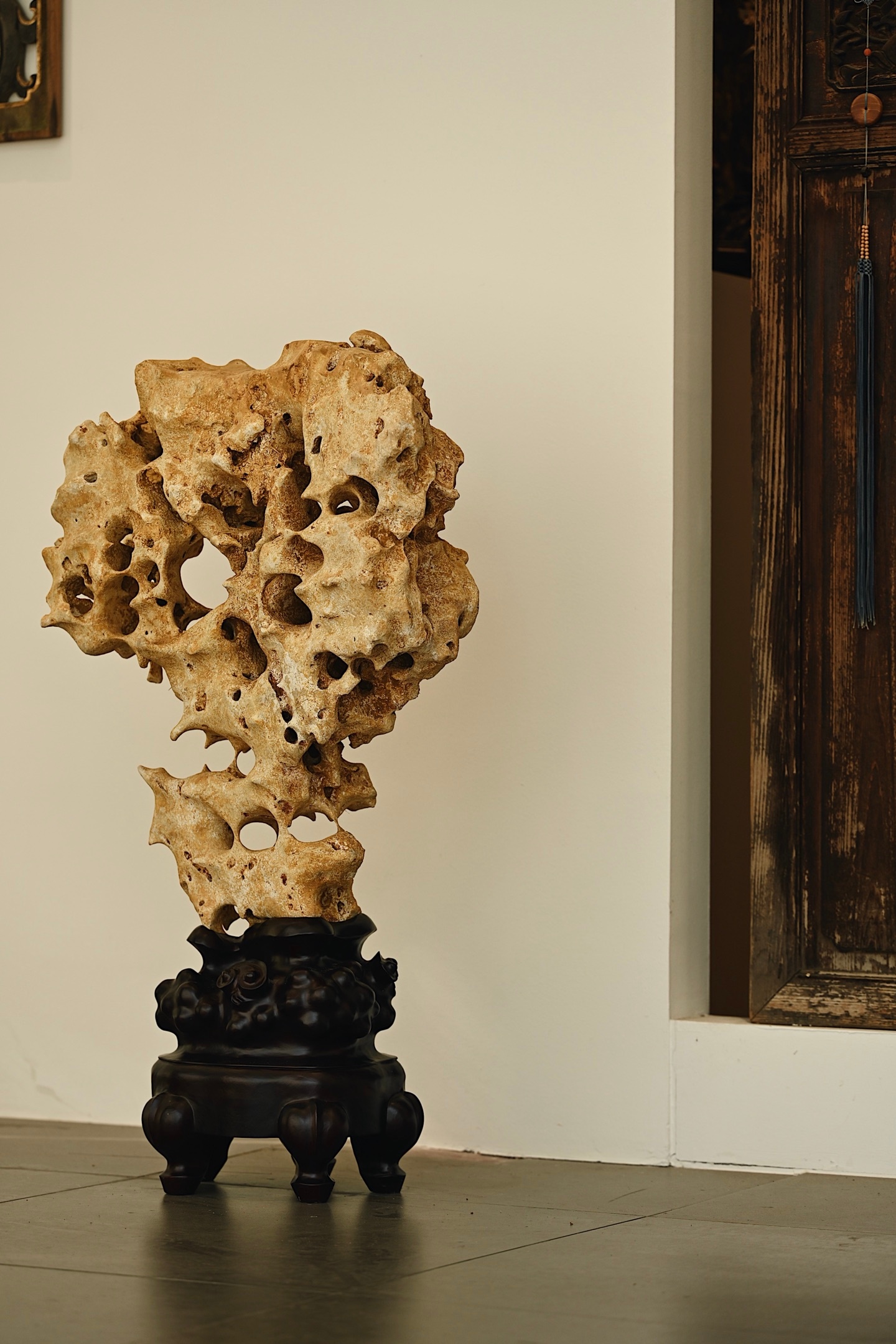 体型较大,石体孔洞密布,大小不一,连环贯通,尽显“透漏”之妙;石面纹理褶皱层叠,苍劲古拙,兼具“瘦皱”之姿。整体气韵苍古,形若峰峦,又似云气,置诸案头,咫尺间尽揽山水之趣。