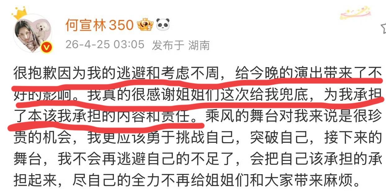 何宣林发文道歉承认自己逃避责任,把不好唱的部分歌词分给队友,自己选择唱好唱的部分,但她的道歉发文却没有一个队友出来回应安慰。