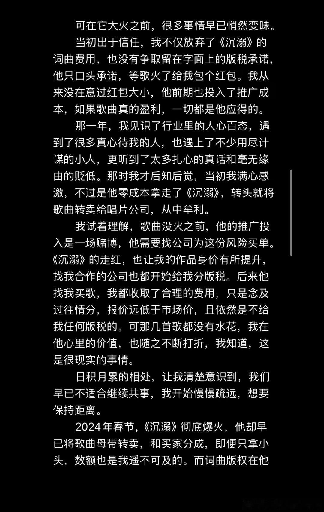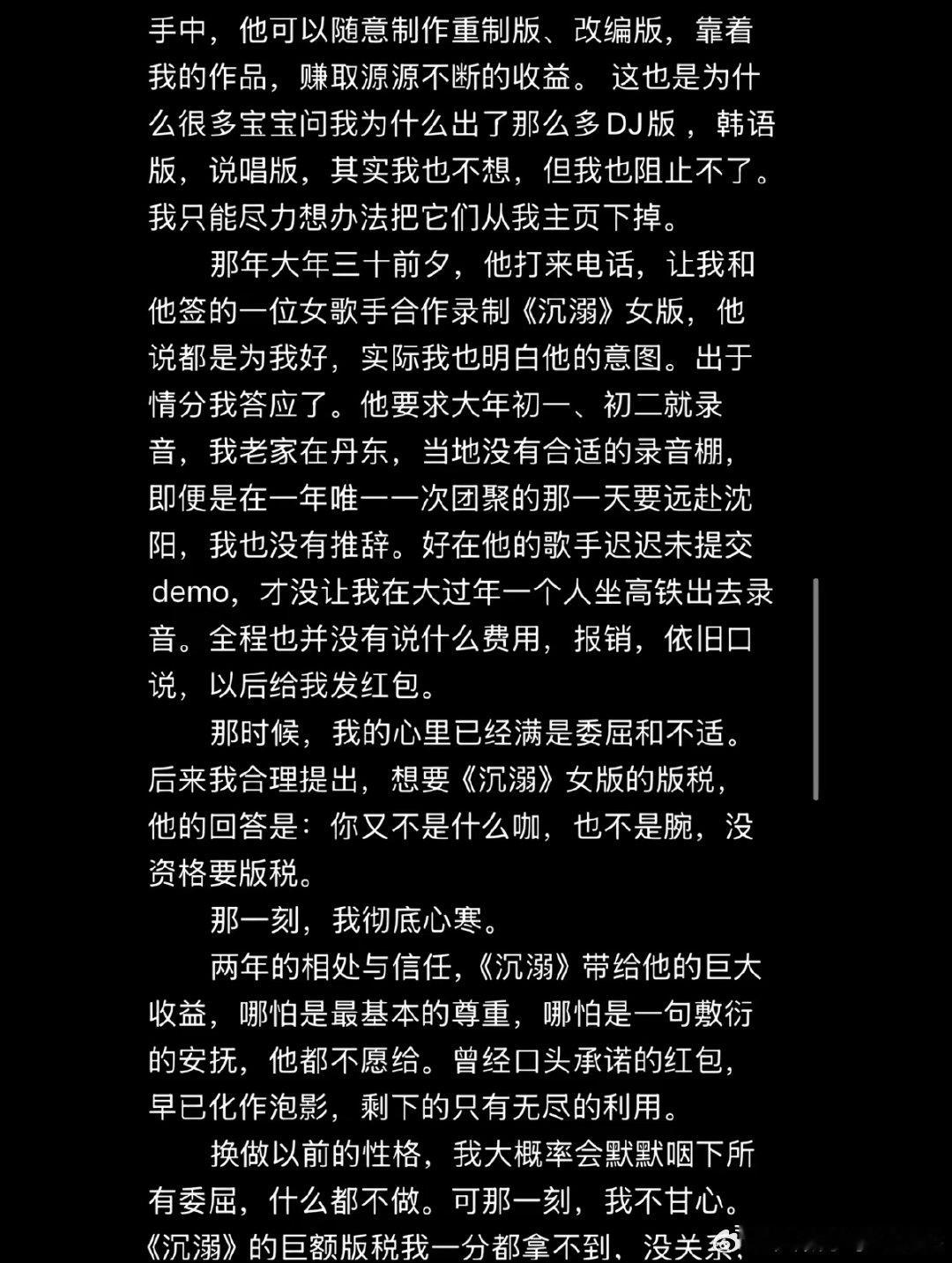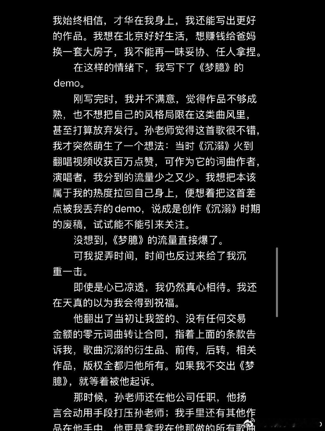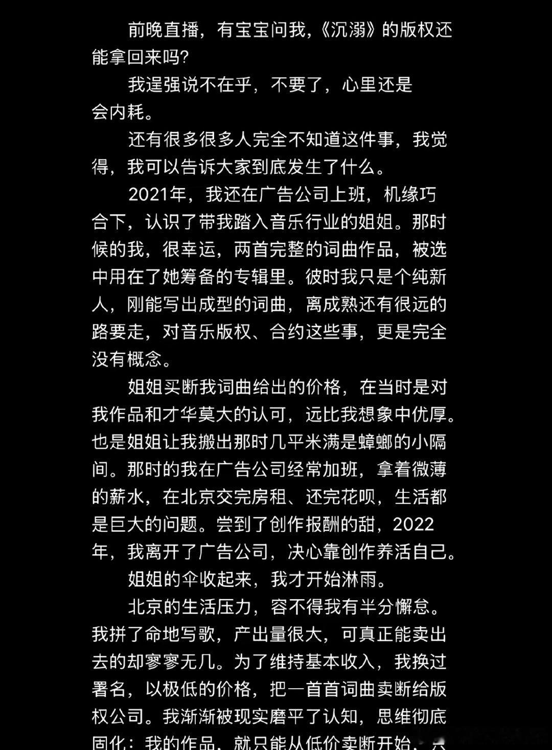 【邹沛沛长文控诉版权方 】邹沛沛曾因版权被威胁 4月26日晚,邹沛沛在长文中回应了《沉溺》的版权归属问题:她2021年入行时是新人,为维持生计曾低价卖断作品,《沉溺》因无人看好推广前景,她最后出于信任将词曲免费交给一位行业前辈推广,未签署任何书面版税协议,仅得到“歌火了给红包”的口头承诺。邹沛沛回应沉溺版权
