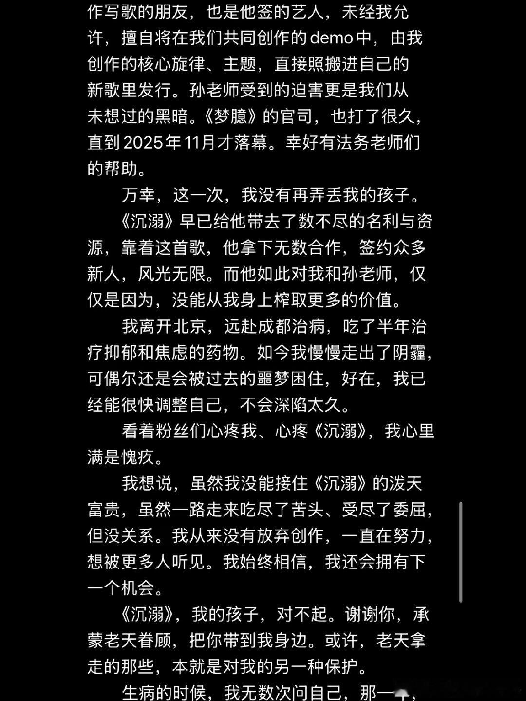 邹沛沛后续创作《梦臆》,被对方以“零元词曲转让合同包含衍生作品版权”为由起诉,威胁她交出《梦臆》版权,并打压她与同事。经过漫长诉讼,2025年11月她才保住了《梦臆》的版权,却因此患上抑郁和焦虑,一度停更养病。
