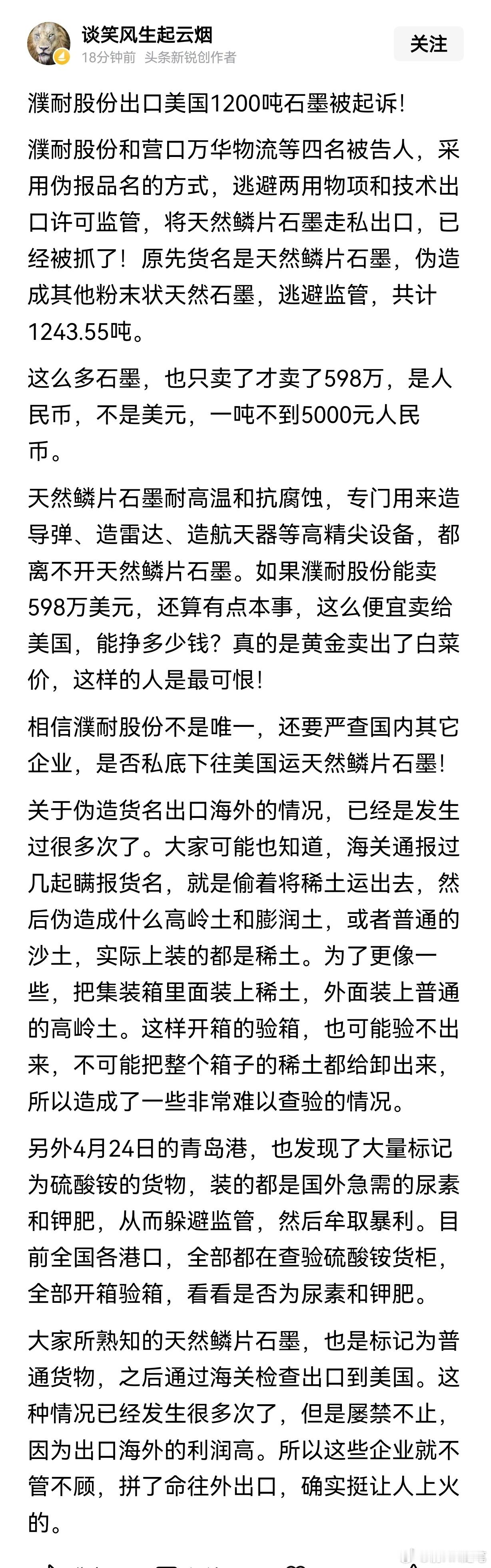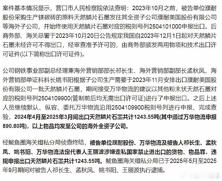 濮耐股份和营口万华物流等四名被告人,采用伪报品名的方式,逃避两用物项和技术出口许可监管,将天然鳞片石墨走私出口,已经被抓了!原先货名是天然鳞片石墨,伪造成其他粉末状天然石墨,逃避监管,共计1243.55吨。这么多石墨,也只卖了才卖了598万,是人民币,不是美元,一吨不到5000元人民币。天然鳞片石墨耐高温和抗腐蚀,专门用来造导弹、造雷达、造航天器等高精尖设备,都离不开天然鳞片石墨。如果濮耐股份能卖598万美元,还算有点本事,这么便宜卖给美国,能挣多少钱?真的是黄金卖出了白菜价,这样的人是最可恨!