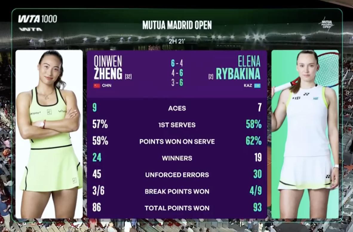 郑钦文9记Ace,9次双误,24个制胜分,45次非受迫失误,破发点把握率50%。莱巴金娜7记Ace,1次双误,19个制胜分,30次非受迫失误,破发点把握率44%。