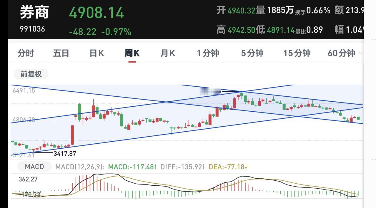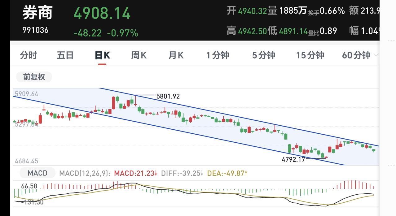 券商板块日线级别处于下跌通道中,最近的一段时间都是在这个下跌通道上轨线下方震荡,近期观察能不能上涨突破这个下跌通道的上轨线,只有上涨突破了这个下跌通道的上轨线,才可以考虑要不要进场,如果缓慢下跌到这个下跌通道下轨线附近,超短线的人也可以考虑部分进场。