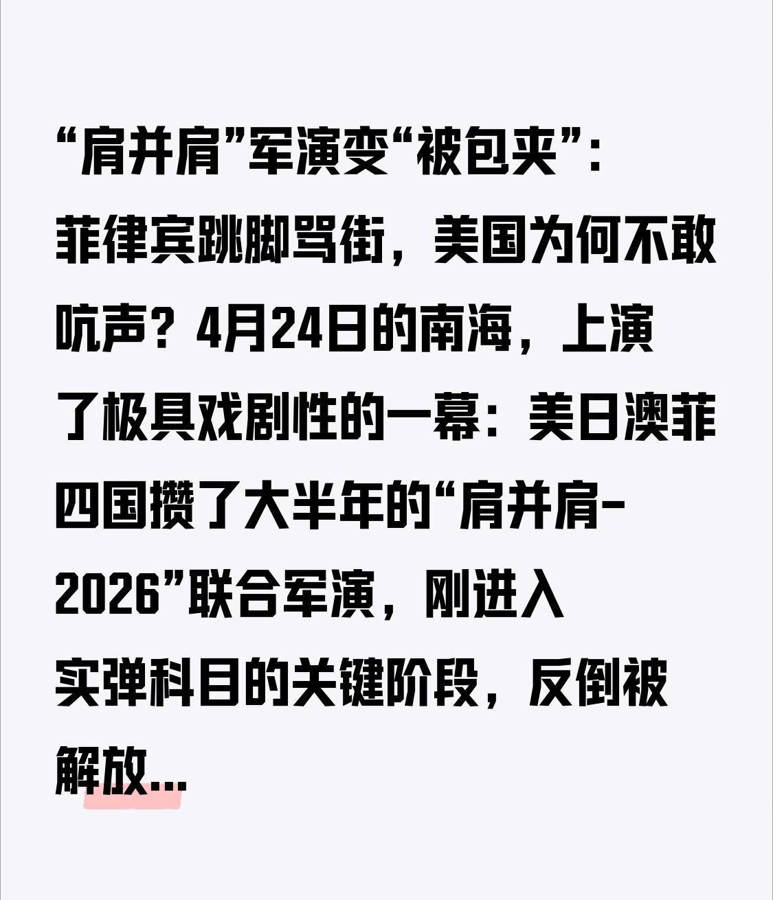 4月24日的南海,上演了极具戏剧性的一幕:美日澳菲四国攒了大半年的“肩并肩-2026”联合军演,刚进入实弹科目的关键阶段,反倒被解放军来了个左右夹击。菲律宾急得跳脚骂街,牵头的美国却一反常态全程沉默,这场本来冲着中国来的示威,硬生生变成了搬起石头砸自己的脚。