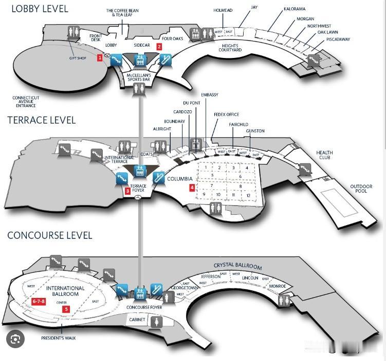华盛顿希尔顿酒店的宴会大厅在地下三层。这一次,在地下二层设有一个安检口,通过安检口,走楼梯到地下三层,就可以拐弯进入宴会大厅。