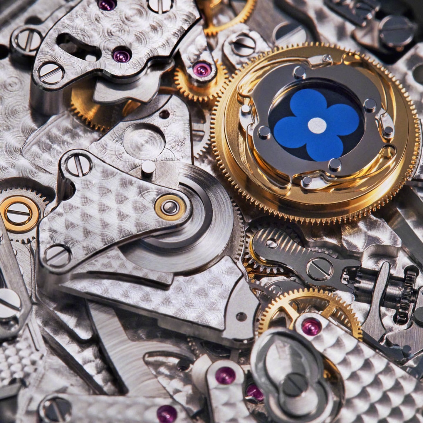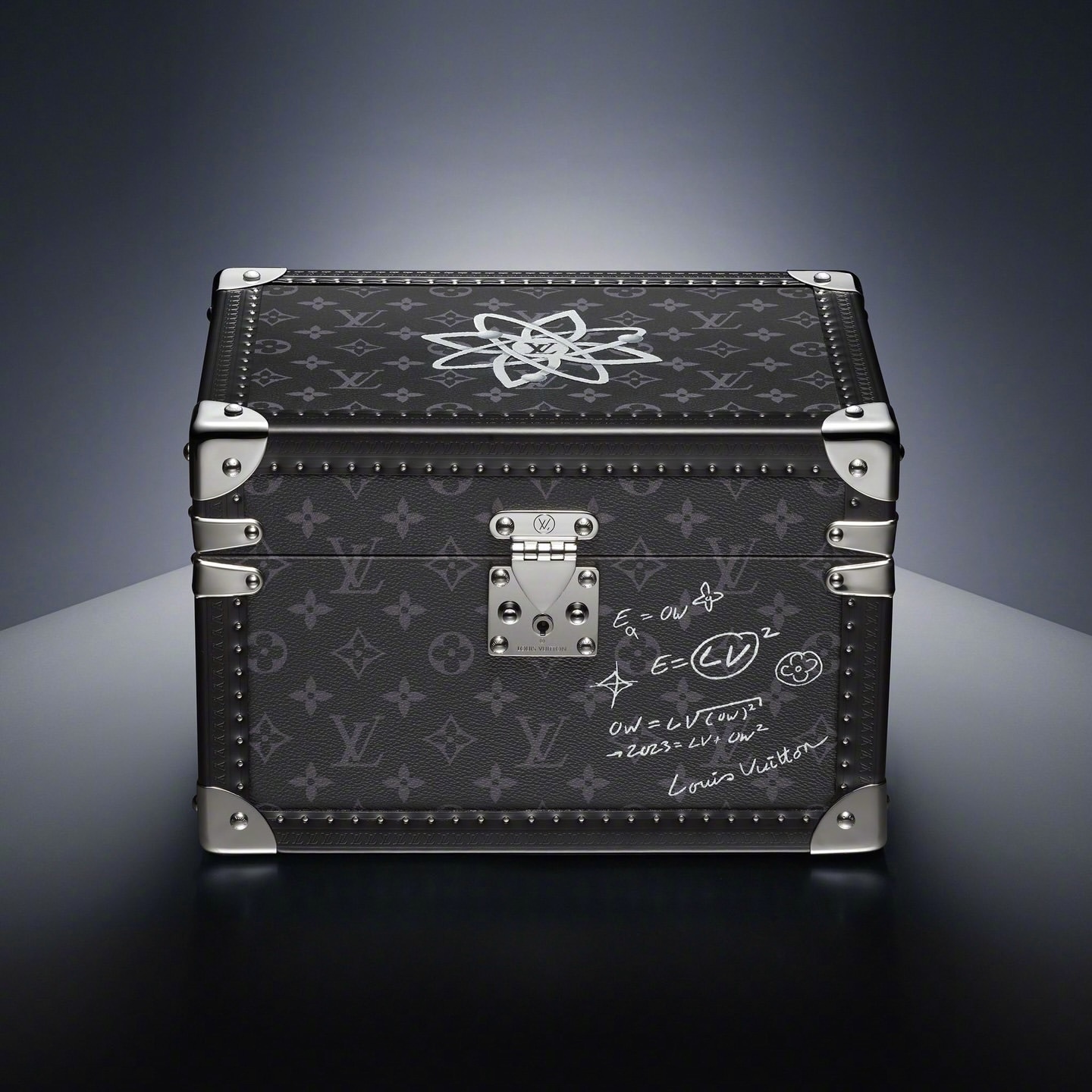 黑板造型的表盘同样出自 Doublel 之手,上面的“粉笔涂写”巧妙融合了爱因斯坦的科学公式与 Louis Vuitton 自身的符号元素,形成若隐若现的视觉隐喻。按下位于 2 点钟、隐藏在爱因斯坦头发中的按钮,会通过他额头的圆形窗口显示小时;7 点位镶钻的“自动原子核”则以白色指针尖端作逆跳运动,指示分钟。10 点位的动力储存显示窗口,则以他著名的公式 E=mc² 进行改编——当“E”等于“LV”时,表示上链已满(最长可达 100 小时动力储备)。
