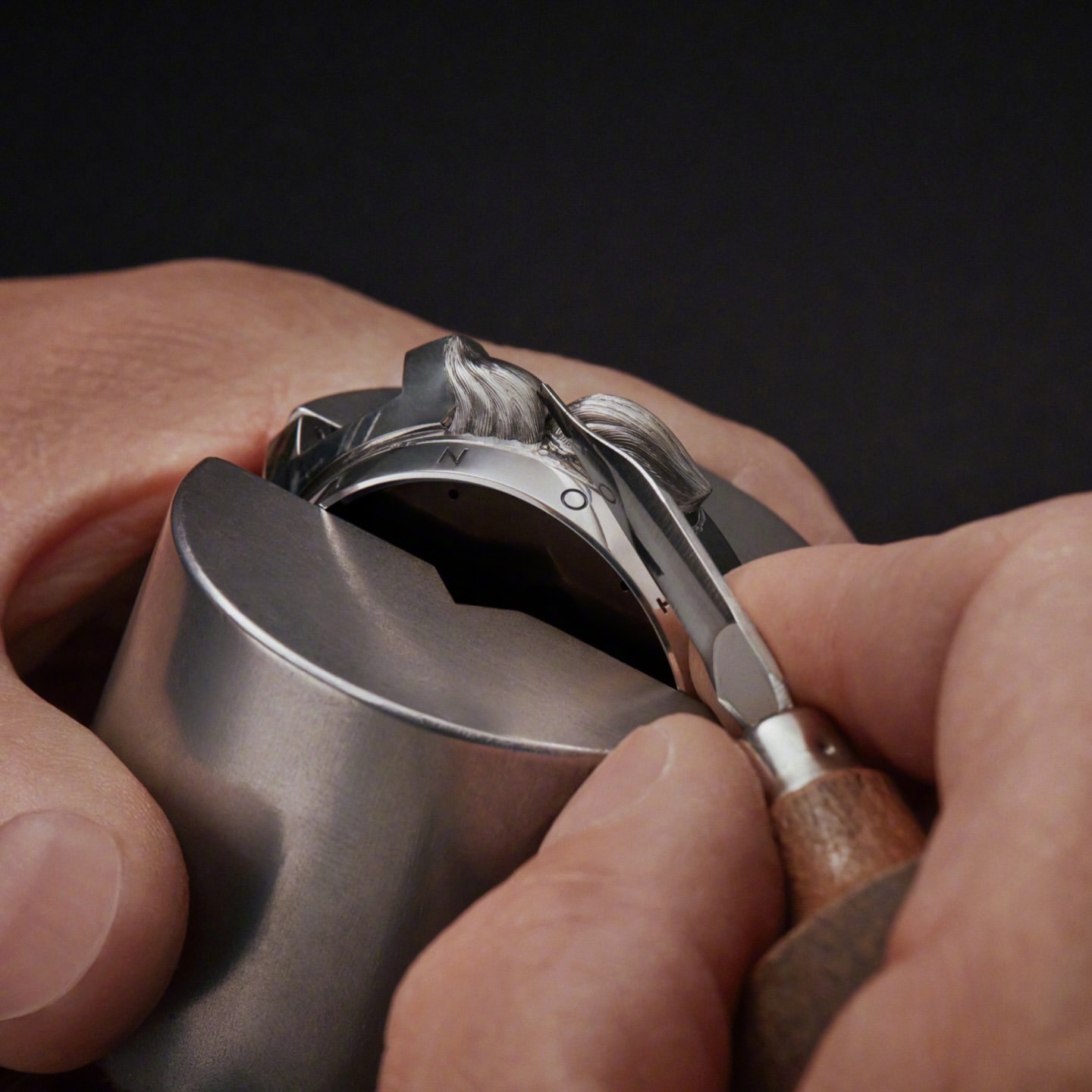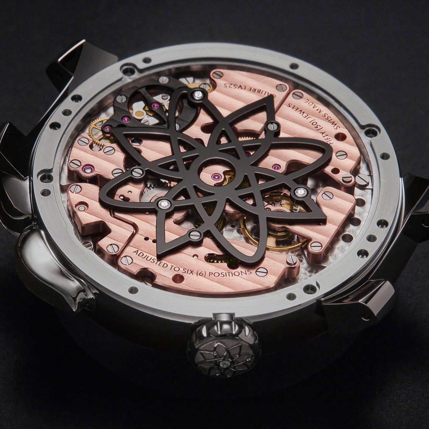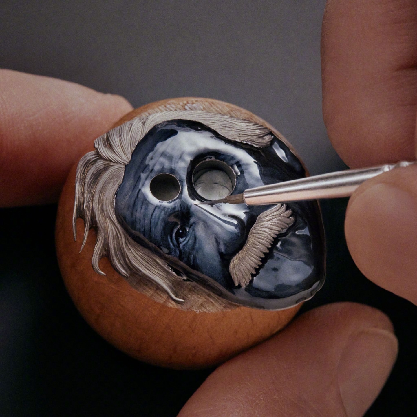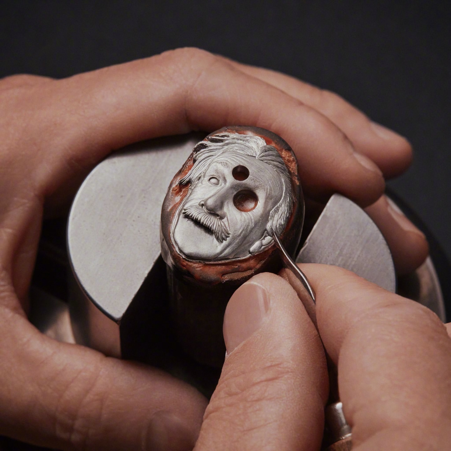 这枚作品的表盘以 18K 白金与灰彩珐琅(grisaille enamel)重现了革命性物理学家阿尔伯特·爱因斯坦在 1951 年那张著名照片中的面容。Dick Steenman 通过手工浮雕雕刻,让爱因斯坦的头发和胡须栩栩如生,其中一部分还延伸至不锈钢表壳构成了 2 点钟位置的按钮);Nicolas Doublel 则以灰彩珐琅工艺描绘爱因斯坦的面部,在淡蓝与银灰色调中呈现出既写实又略带超现实感的神韵。