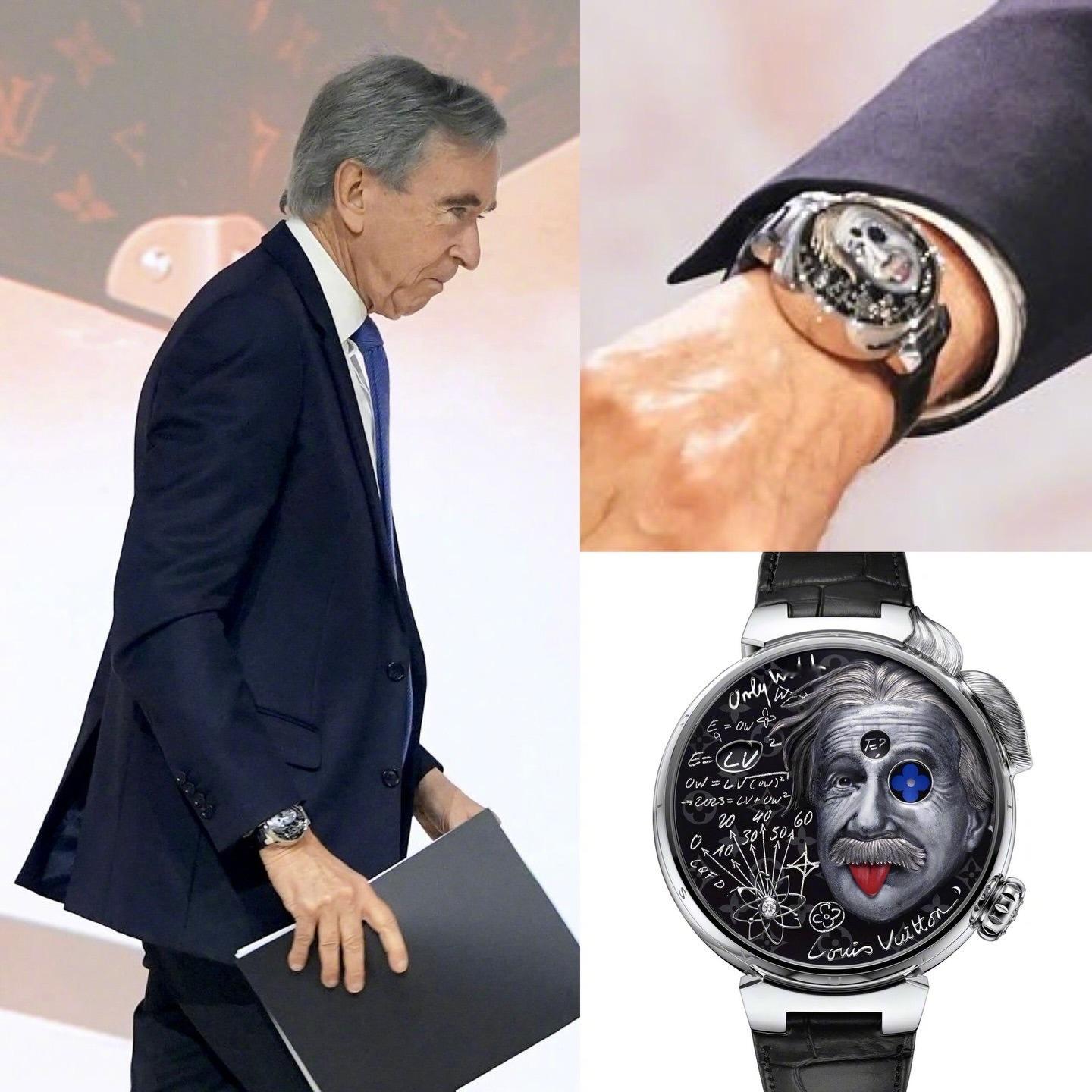 LVMH总裁兼CEO贝尔纳·阿尔诺佩戴了一枚独一无二的 Louis Vuitton Tambour Einstein Automata 腕表。这枚作品是基于 Louis Vuitton Tambour Automata 机械自动人偶平台,搭载相同的 LV 525 型机芯。按下 2 点钟位置的按钮,腕表便会“按需报时”,同时驱动表盘上的动态机械动画。表盘上丰富又细腻的装饰艺术细节,一直延伸至表壳,甚至连专属表盒也被制作成 Louis Vuitton 标志性的旅行箱造型。这枚 Tambour Automata 腕表⌚️成为了展示 La Fabrique du Temps 制表工坊在高级制表工艺、复杂结构制造能力,以及 LV 在顶级定制领域所能提供的无限个性化可能性的绝佳载体。
