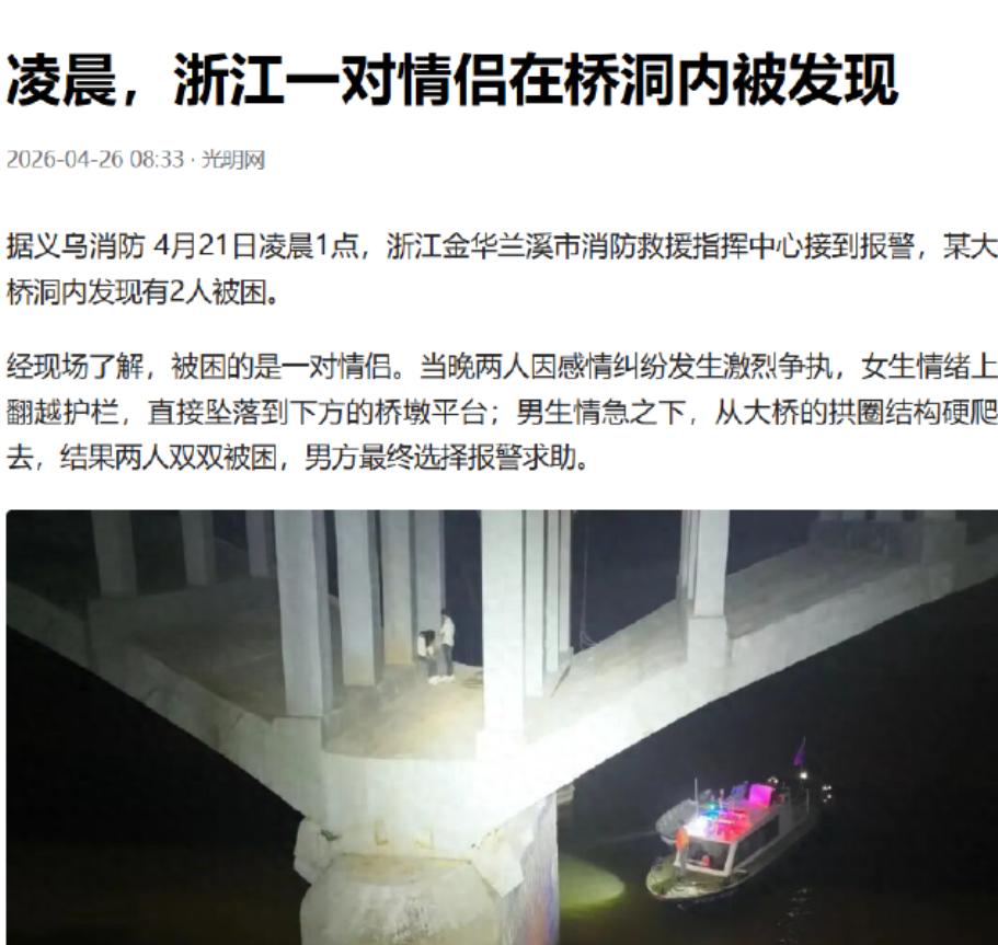 浙江义乌,凌晨1点,一对情侣在大桥上吵架,俩人因为感情问题越吵越凶,女子气的直接要往河内跳跃,正好就掉在了下层的桥洞内。男生也要吓死了,立刻往下跳准备去搭救女友,当时正好有个拱圈结构,男生正好可以继续往下爬。结果,情侣俩都困在桥洞内了,幸亏男生及时劝住了女友,她暂且也没有继续往下跳的念头。被困后,男生赶紧打电话报了警。