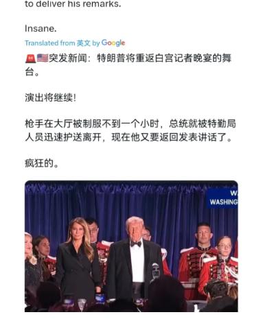 更让外媒集体震惊的是,就在枪手被特勤局当场制服,事件发生还不到一个小时的时间里,特朗普做出了一个让所有人都意想不到的决定——重返晚宴现场,完成他本该发表的讲话。他甚至直接对外明确宣布,这场晚宴不会取消,只会改期举行,该完成的流程,一定会继续下去。
