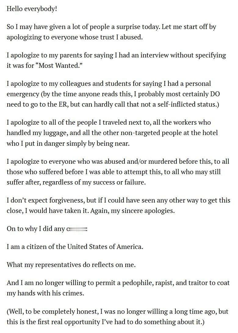 我向所有与我同行的人道歉,所有处理我行李的工作人员,以及酒店里所有仅仅因为靠近而置之危险的非目标人员。 我向所有在此之前遭受虐待和/或谋杀的人道歉,向所有在我能够尝试之前受苦的人道歉,向所有可能之后仍会受苦的人道歉,无论我成功或失败。