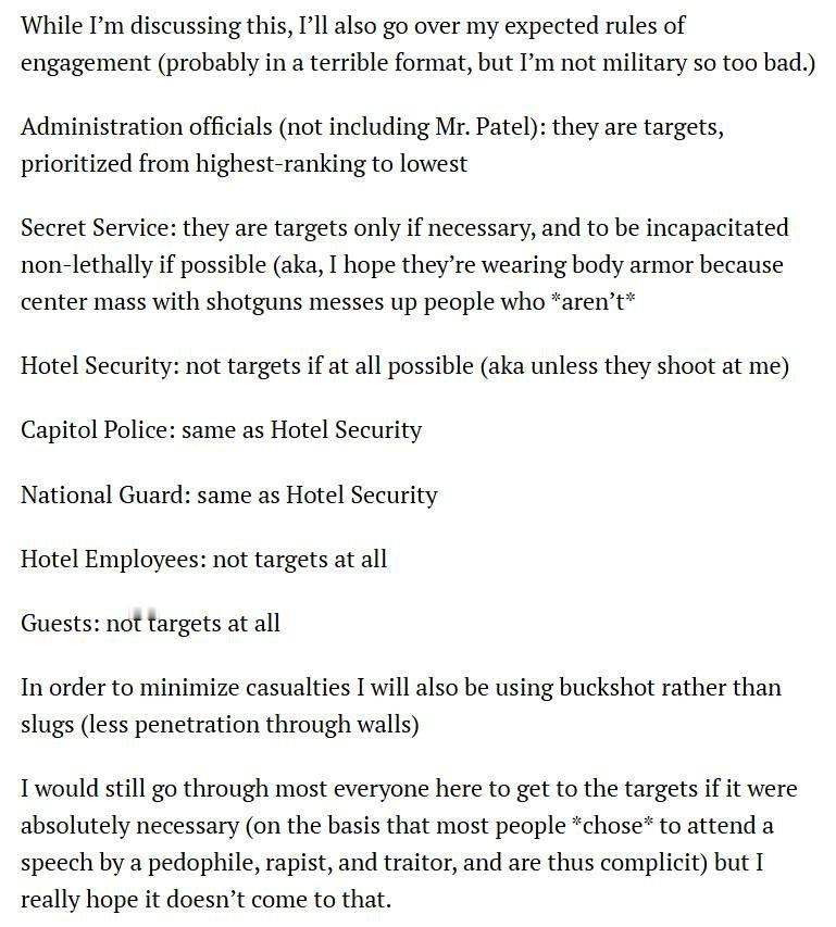 国会警察:与酒店保安相同 国民警卫队:与酒店保安相同 酒店员工:根本不是目标 嘉宾:根本不是目标。为了减少伤亡,我还会用鹿弹而不是弹头(穿墙力更小)。如果绝对必要(因为大多数人*选择*参加恋童癖、强奸犯和叛徒的演讲,因此是共犯),我仍会通过这里大多数人的观点来找到目标,但我真的希望事情不会发展到那一步。