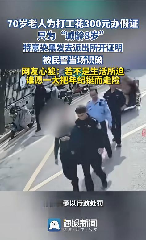 信息来源:《70岁老人为打工花300元办假证“减龄8岁” 特意染黑发去派出所开证明 被民警当场识破 网友心酸:若不是生活所迫 谁愿一大把年纪铤而走险》海报新闻