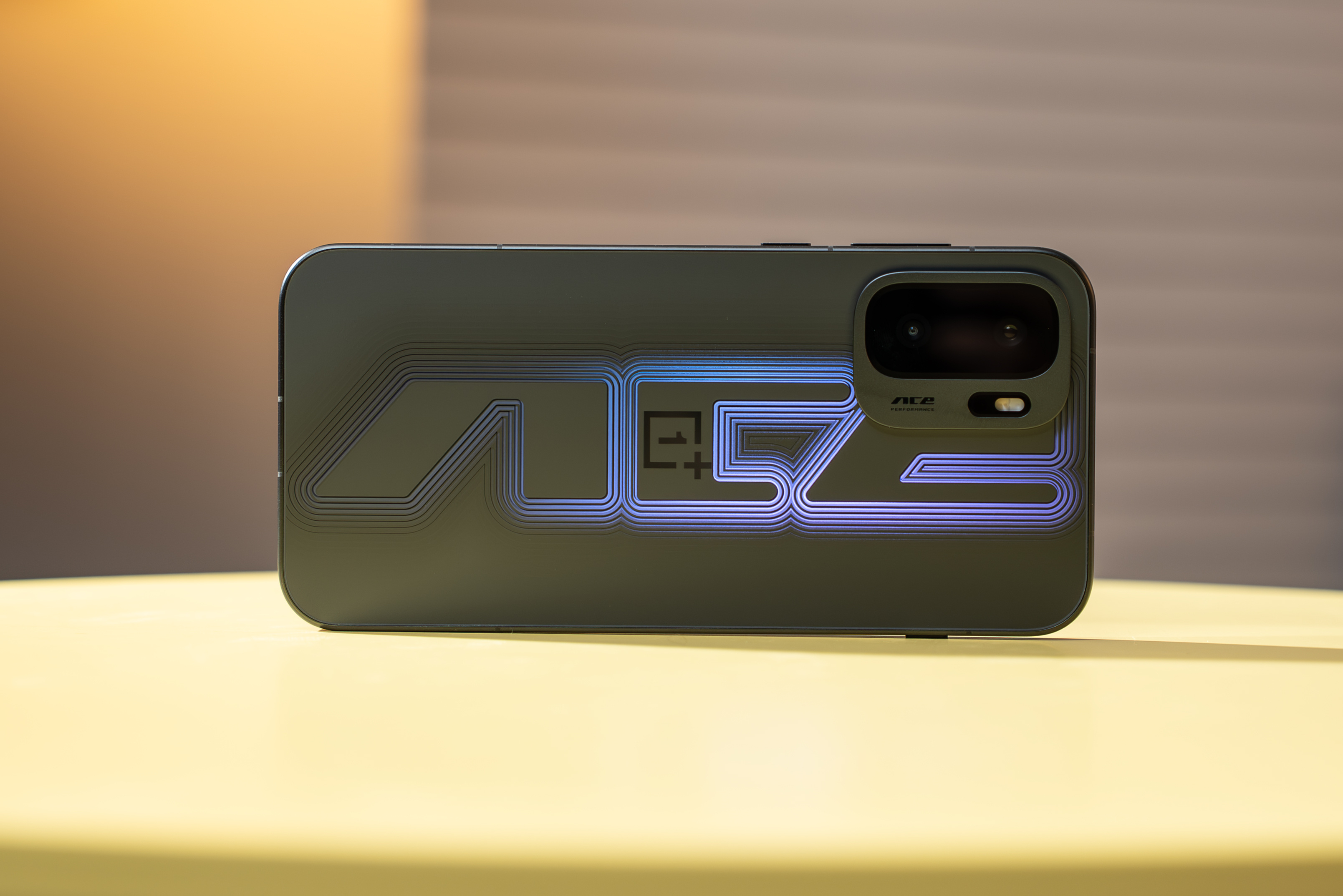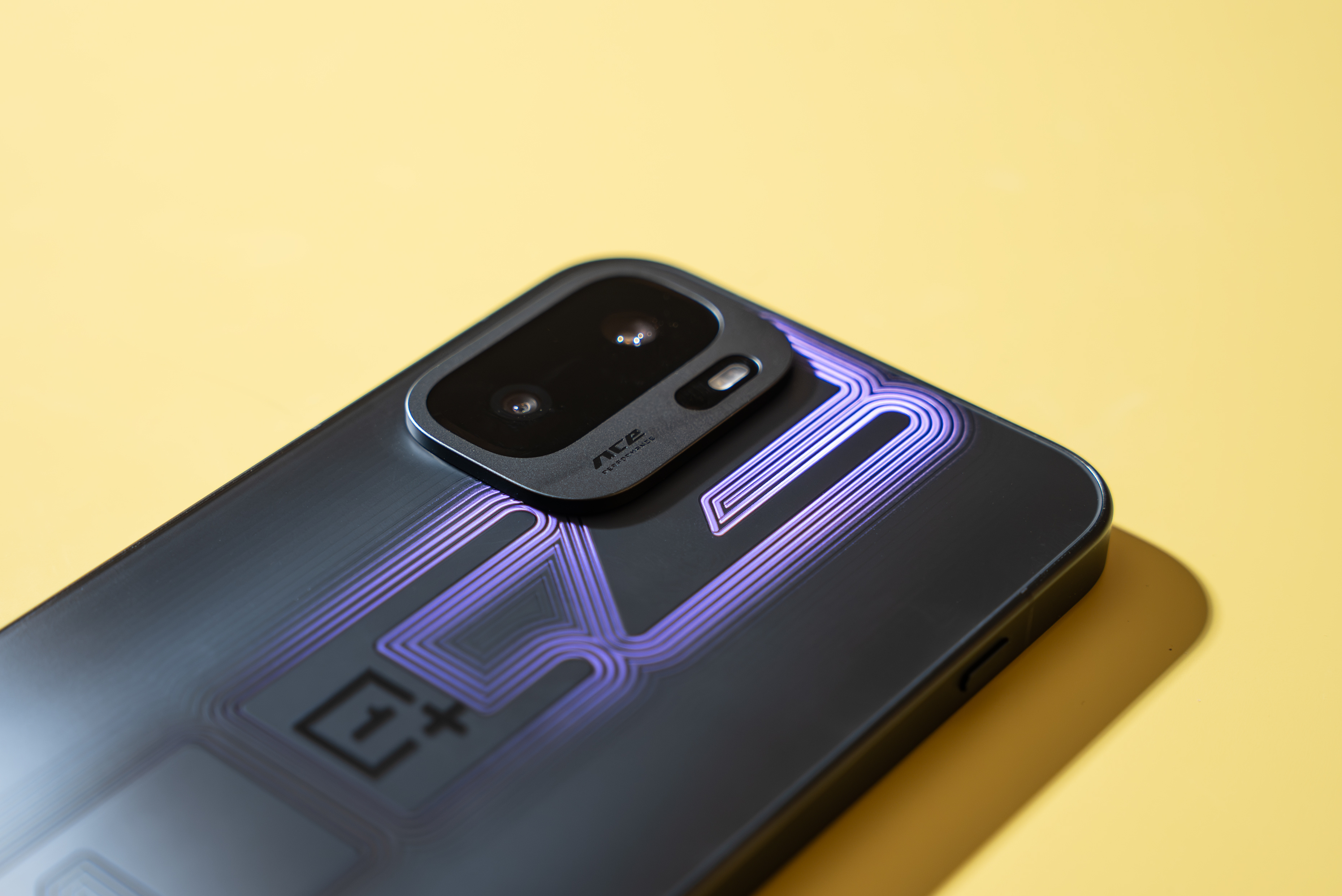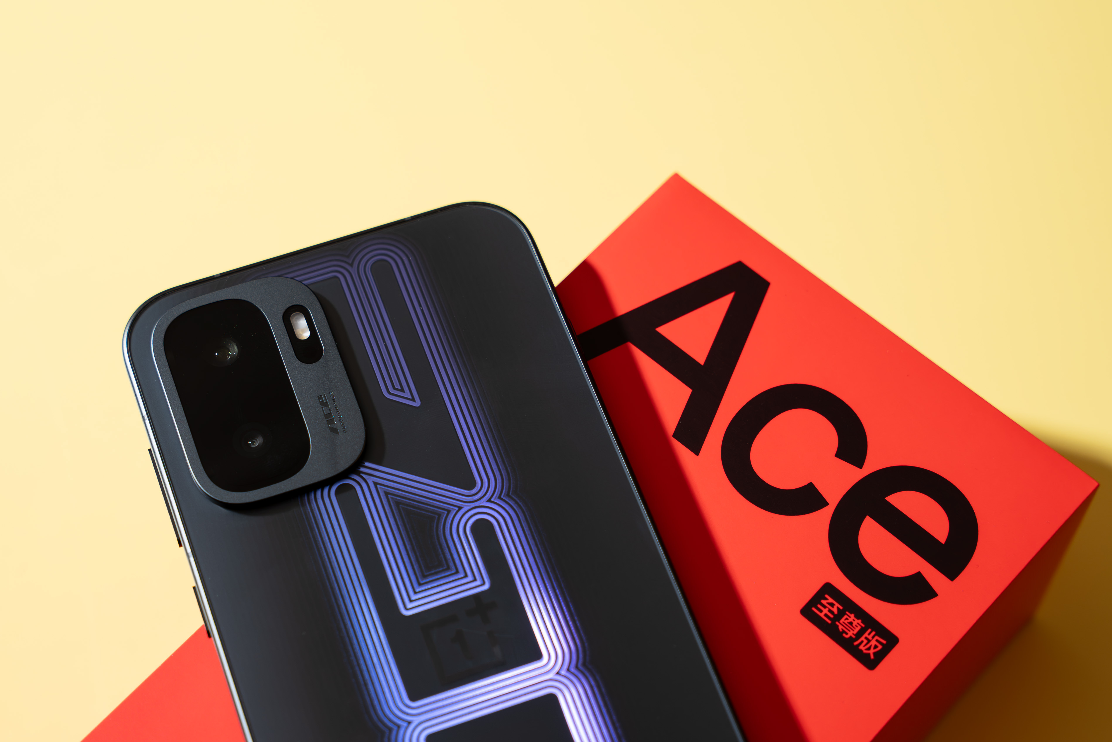 一加 Ace 6 至尊版的后壳设计辨识度很高,通过 3D 立体刻光工艺和叠层图案镀膜技术,雕刻出蓝紫色的 Ace 光标。左上角的相机模组做了大 R 角,横向握持打游戏的时候也不容易挡手。正面是一块 165Hz 刷新率、1.5K 分辨率的屏幕,还支持雨水触控 2.0。