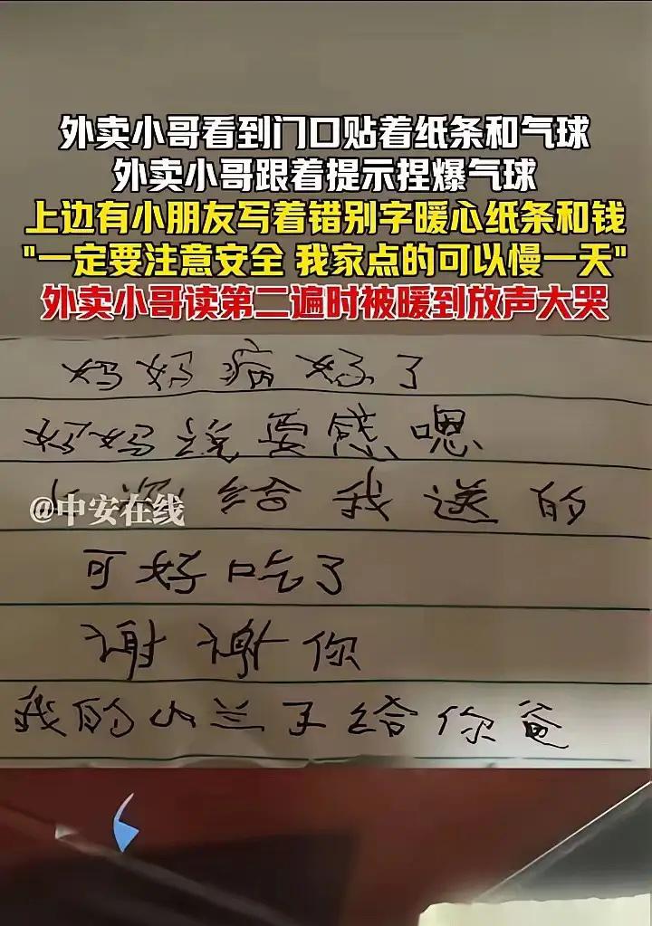 小哥接过水杯,手有点抖。他自己也是农村出来的,家里有生病的母亲和正在上初中的妹妹。为了多赚点钱,他每天都要跑十几个小时的单。他被顾客骂过,被投诉过,被要求带各种东西不带就给差评。他以为自己早就被生活磨得麻木了,可是今天这个小女孩的一句话,让他心里最柔软的地方被撞了一下。