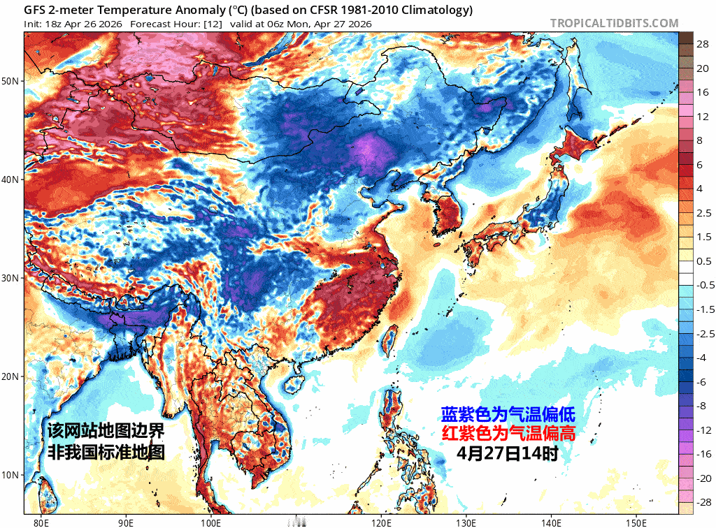 另外4月30日-5月1日,江淮江南等地雨停升温,主要是最高气温回升明显,最低气温的变化不大,甚至还有下降,因此昼夜温差会显著拉大。比如合肥28日14-15℃,温差1℃。30日7-22℃、温差15℃,5月1日8-25℃,温差17℃。因此未来江淮江南一带的朋友要及时增减衣服,小心感冒。
