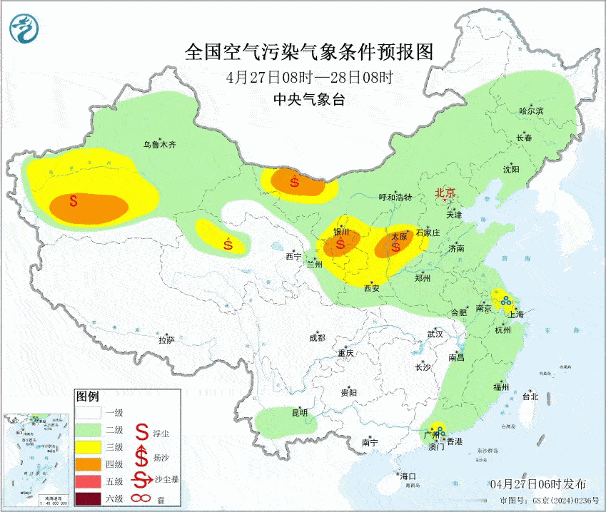 3、风沙本周北方地区多风,尤其是中午-下午时段,叠加高空动量下传,阵风更强。27日至28日,内蒙古西部、山西中南部、陕西中部、宁夏、甘肃中西部、青海柴达木盆地、新疆南部等地的部分地区有扬沙或浮尘天气。29日夜间至5月1日,内蒙古西部、宁夏、甘肃中西部、青海柴达木盆地、新疆南部还有扬沙或浮尘天气。