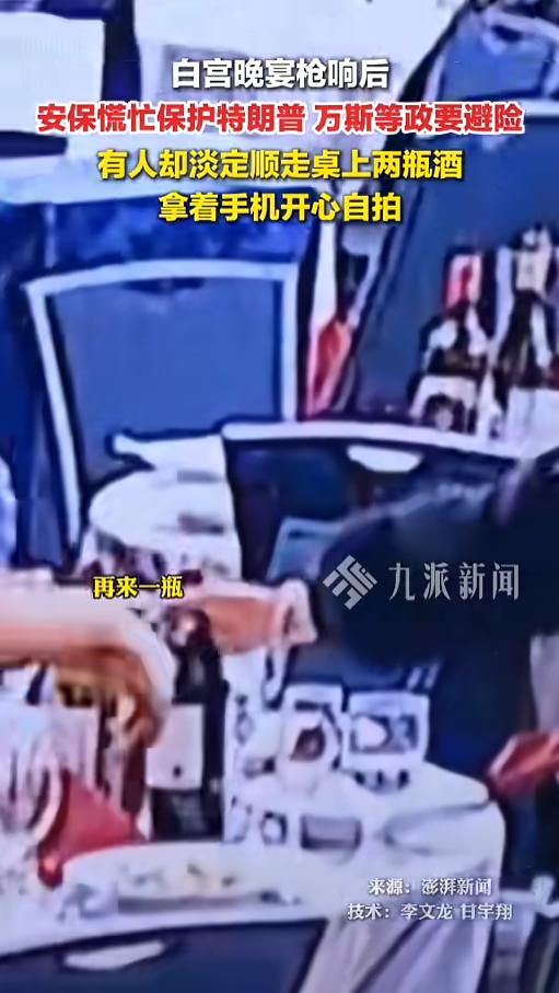 “优雅永不过时!”当地时间4月25日,美国,一场白宫记者晚宴上,突然传出枪声。领导人在安保的护送下离开,场面一度十分混乱。有客人趁此机会,将桌上没开封的酒给顺走了,拿的时候十分淡定,显得很优雅!网友:见过大世面的!