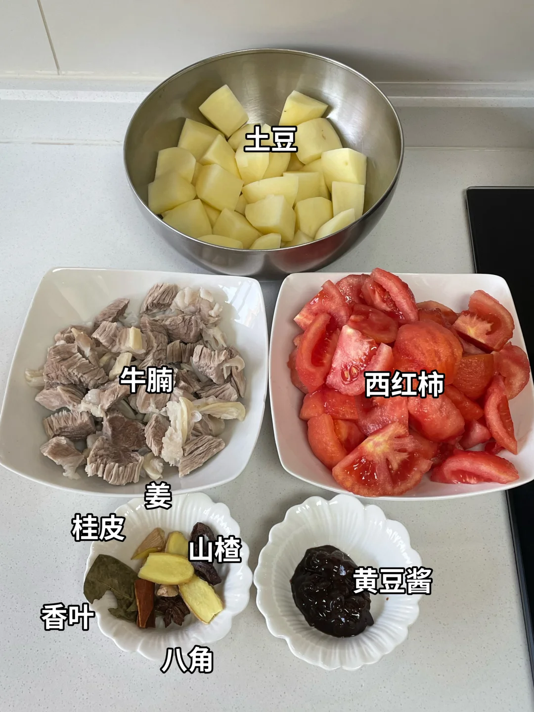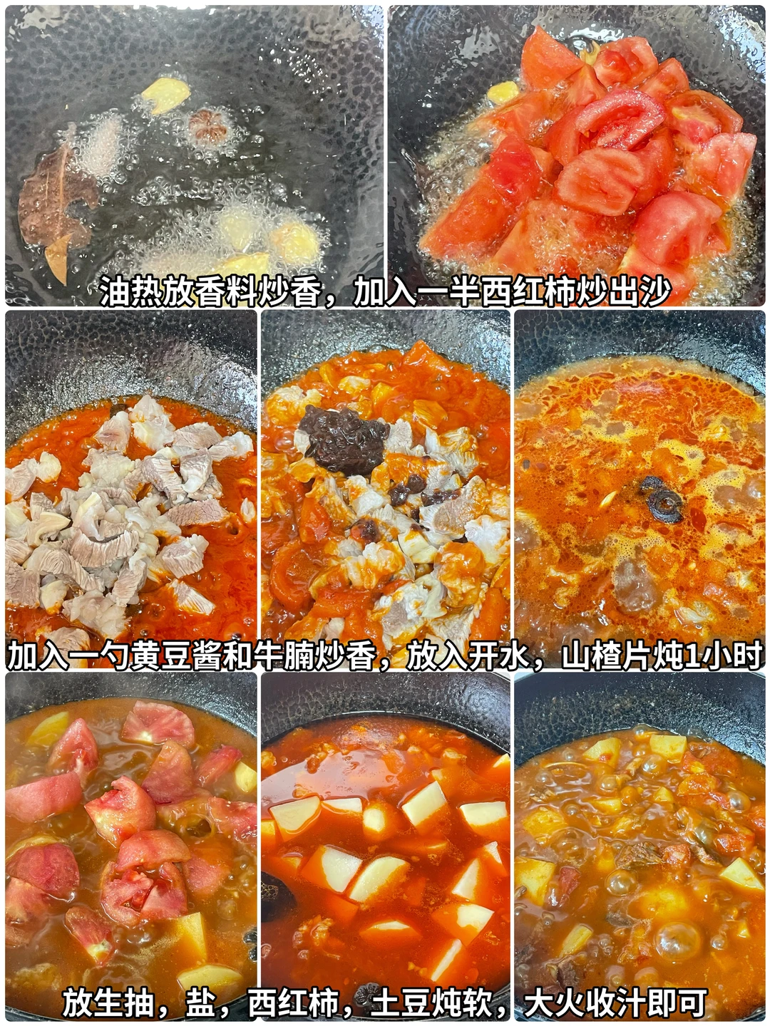 起锅烧油,油热将八角、桂皮、香叶、生姜炒出香味,放入一半西红柿炒出沙,加入一勺黄豆酱炒出豆酱味,再放入牛腩炒香,加入开水,放两到三片的山楂为的是让牛腩更加软糯,倒入开水炖1个小时,调味加一勺生抽,适量的盐,然后加入另外一半的西红柿和土豆炖至软烂,最后大火收汁即可