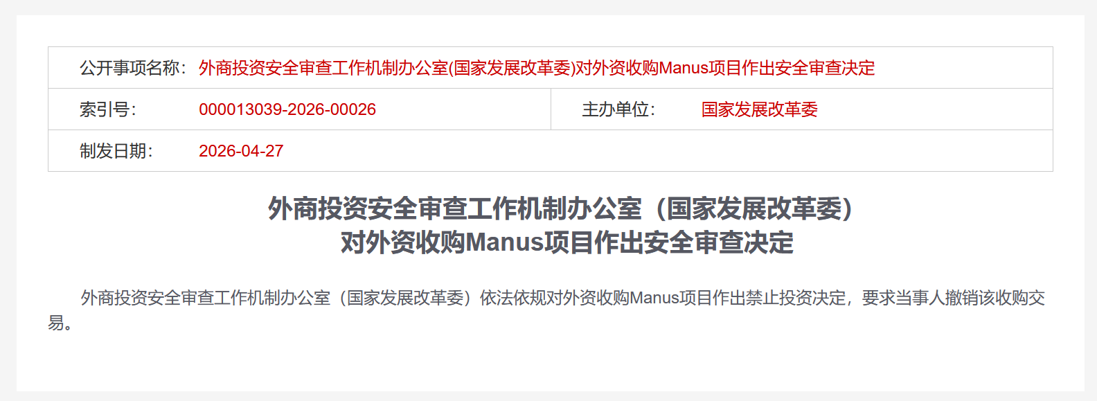 国家发展改革委网站27日消息,外商投资安全审查工作机制办公室(国家发展改革委)依法依规对外资收购Manus项目作出禁止投资决定,要求当事人撤销该收购交易。