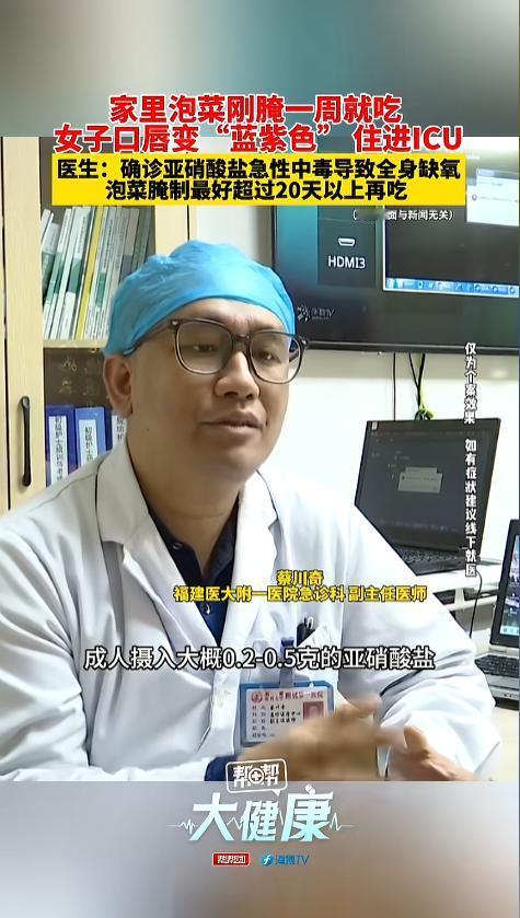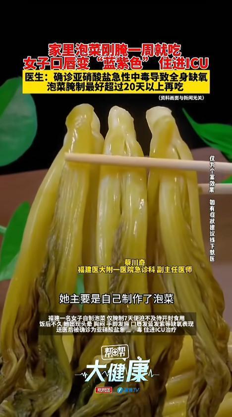 信息来源:《第830集:家里泡菜刚腌一周就吃 女子口唇变“蓝紫色” 住进ICU 医生:确诊亚硝酸盐急性中毒导致全身缺氧 泡菜腌制最好超过20天以上再吃》第一帮帮团