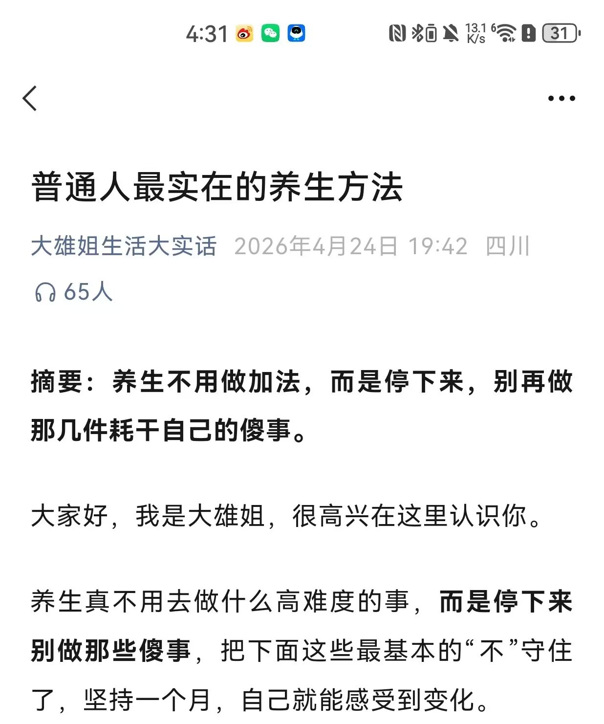 养生最大的骗局,就是以为花钱才能续命。错。真正让你越活越年轻的法子,全在生