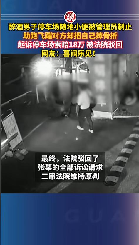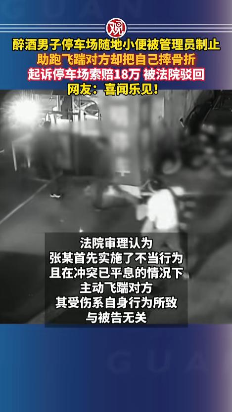 信息来源:《醉酒男子停车场随地小便被管理员制止,助跑飞踹对方却把自己摔骨折,起诉停车场索赔18万被法院驳回,网友:喜闻乐见!》观察者网