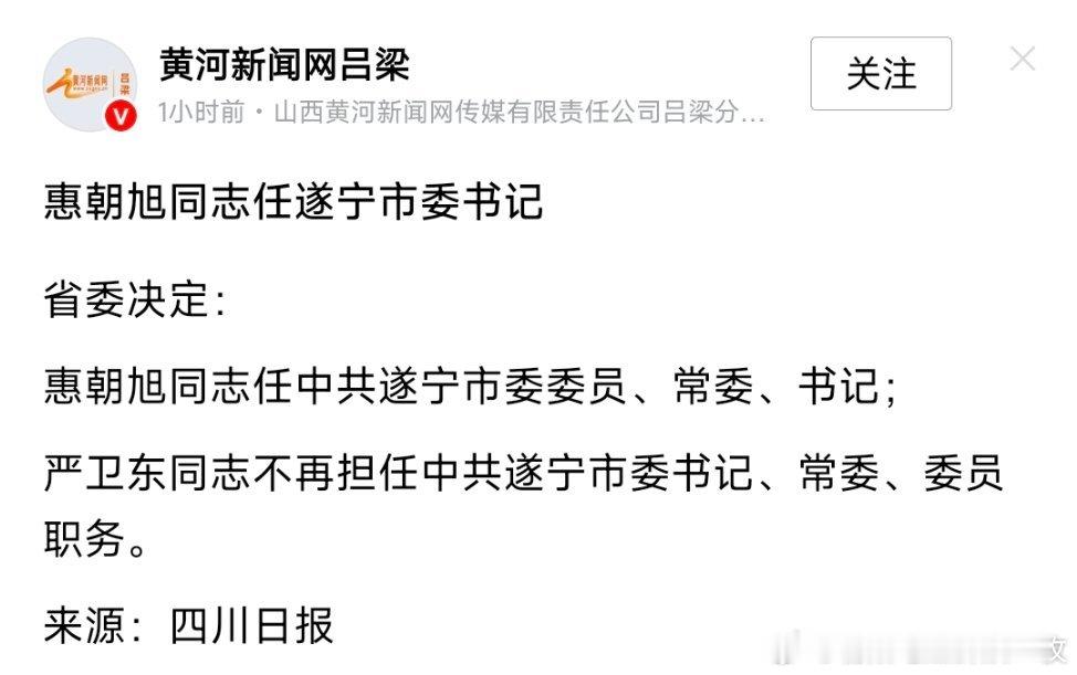 惠朝旭任遂宁市委书记。