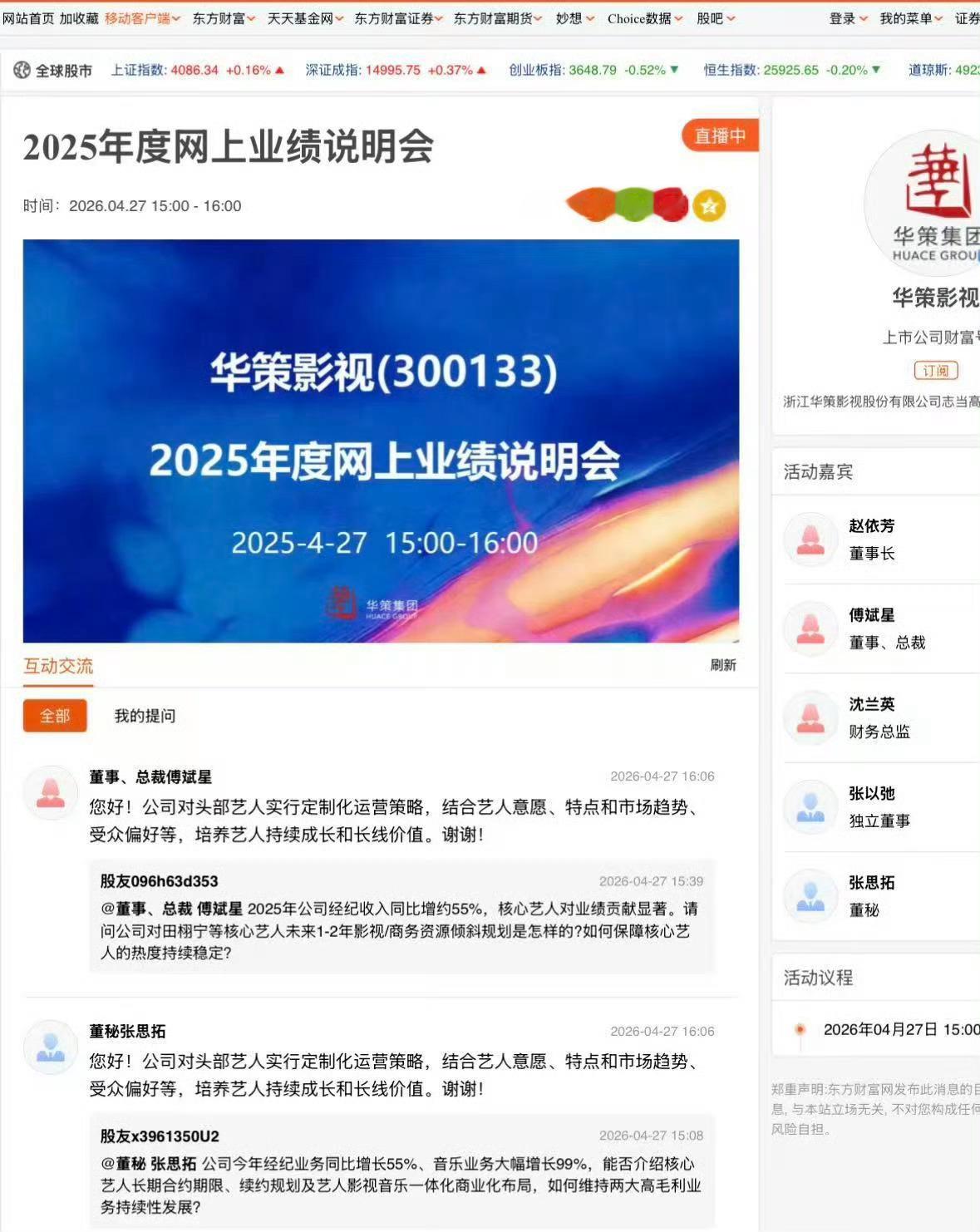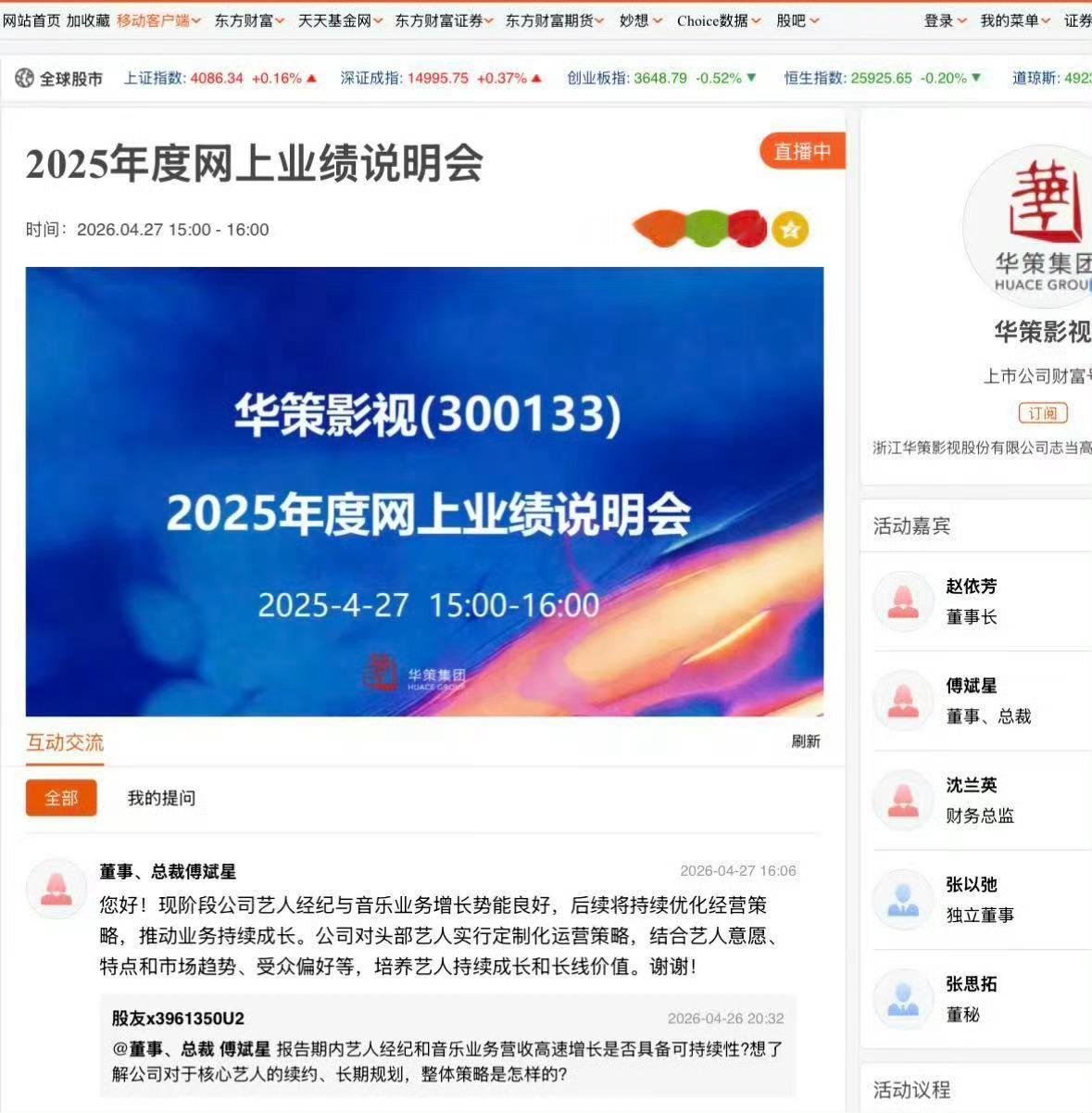 田栩宁华策头部艺人华策影视2025年度网上业绩说明会上,董事、总裁傅斌星回复股友田栩宁相关规划:“公司对头部艺人实行定制化运营策略,结合艺人意愿、特点和市场趋势、受众偏好等,培养艺人持续成长和长线价值。” 华策回应田栩宁未来规划