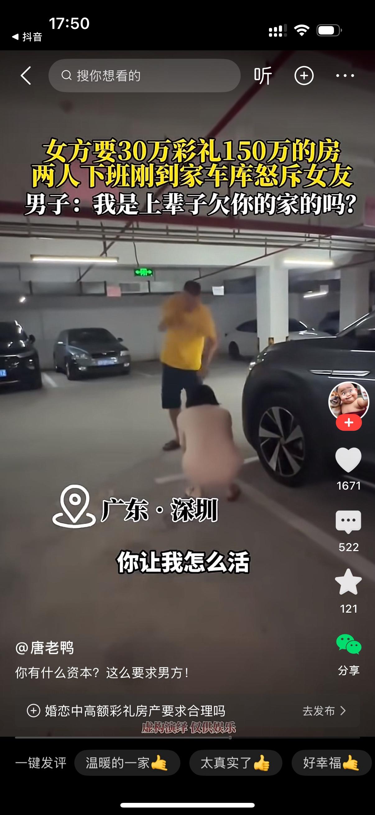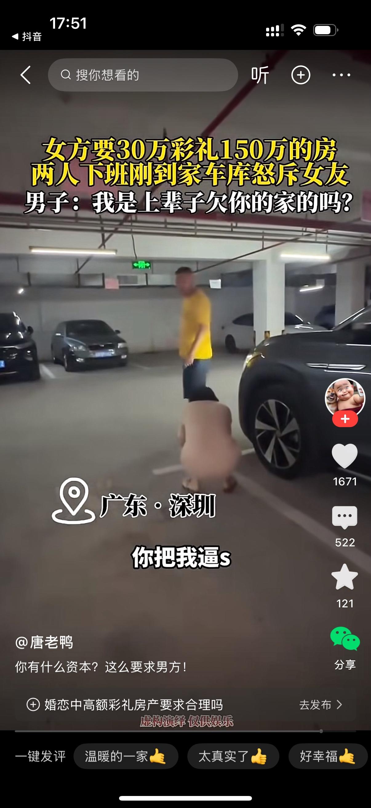 情侣下班刚到车库,男子怒斥女友,30万的彩礼,150万的房,你让我怎么活?你把我逼死?女友哭泣着蹲在地上。男子直接回家,只有委屈。他不知道他对女友的这一番歇斯底里显示的是他的无能。你在深圳工作,如果到了谈婚论嫁的地步,连180万都拿不出来,不是无能是什么?这也就是深圳的中下水平而已。要知道工作十年的深圳人存款至少200万,否则不配在深圳。