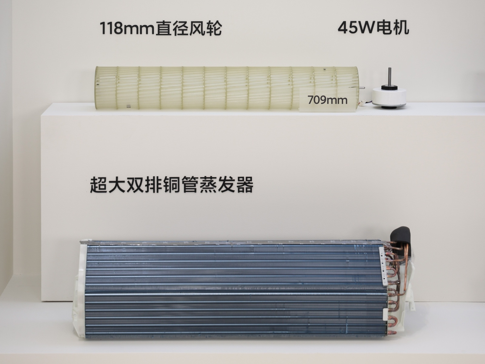 不仅现场展示了米家性能旗舰「强劲风」系列空调 -35℃ 和 65℃ 极限环境下的温控,还直接拆机展示了空调内部结构,能看到用上了 13cc 大排量双缸压缩机,大双排纯铜管冷凝器、蒸发器,还有 118mm 超大直径风轮,可以说是在 3000 左右价格上给了旗舰的配置。