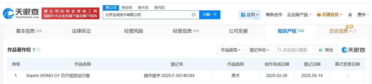 天眼查知识产权信息显示,小米科技有限责任公司已注册多枚“玄戒”“小米玄戒”“XRING O1”商标,国际分类包括医药、乐器、地毯席垫等。此外,北京玄戒技术有限公司登记了“Xiaomi XRING O1芯片视觉设计图”作品著作权,作品类别为美术。
