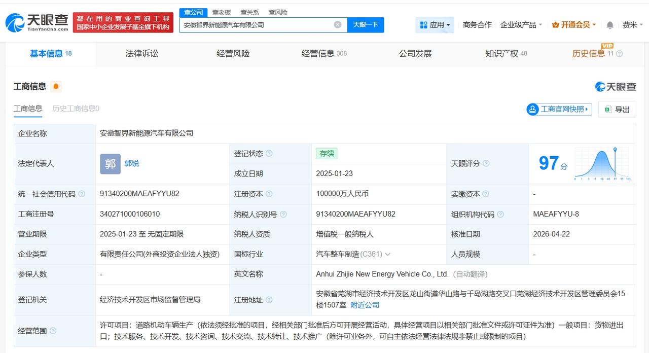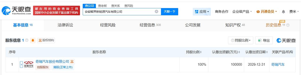 该公司成立于2025年1月,注册资本10亿人民币,经营范围为道路机动车辆生产,货物进出口,技术服务、技术开发、技术咨询、技术交流、技术转让、技术推广,由奇瑞汽车股份有限公司全资持股。