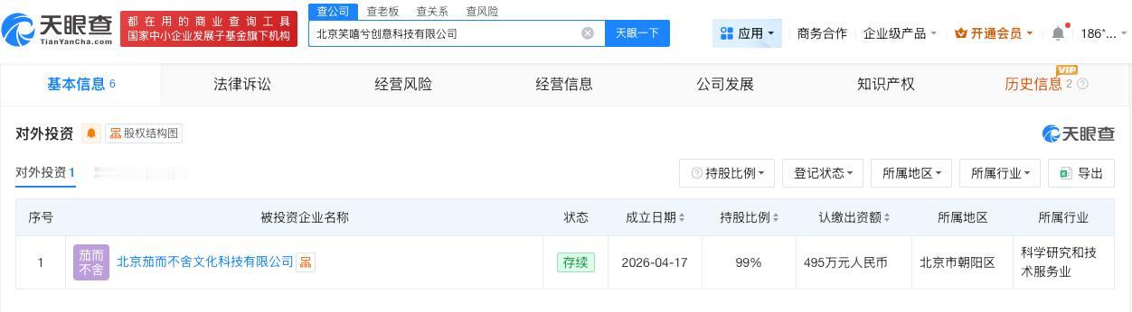 天眼查App显示,3月19日,北京光线影业有限公司、丁舟杰(丁禹兮)共同成立北京笑嘻兮创意科技有限公司,其中北京光线影业有限公司持股51%。对外投资信息显示,4月17日,该公司成立北京茄而不舍文化科技有限公司,最终受益人为丁舟杰(丁禹兮)。