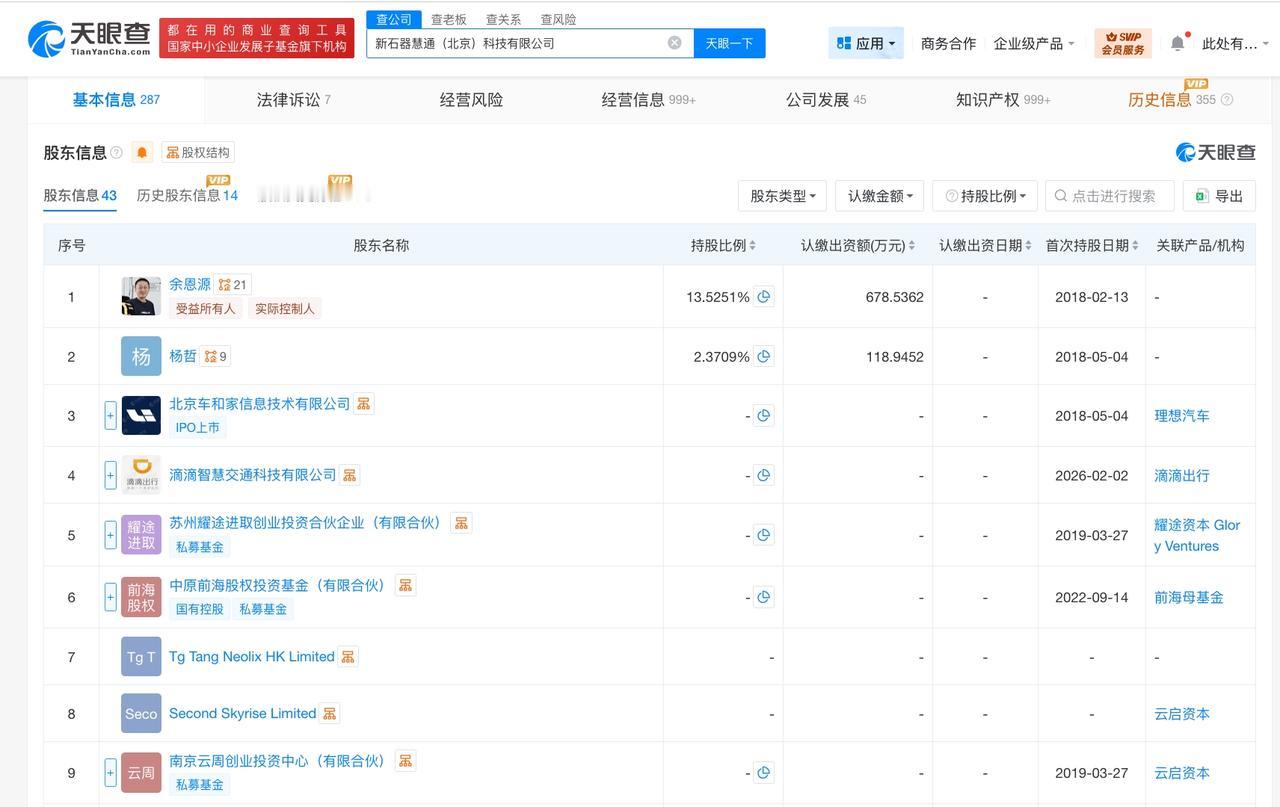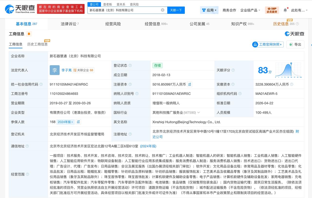 新石器慧通(北京)科技有限公司成立于2018年2月,法定代表人为李子夷,经营范围含工业机器人制造、智能机器人的研发、智能机器人销售、工业机器人销售、人工智能硬件销售、人工智能应用软件开发、人工智能行业应用系统集成服务、服务消费机器人制造、服务消费机器人销售等。股东信息显示,该公司现由余恩源、杨哲及上述新增股东等共同持股。
