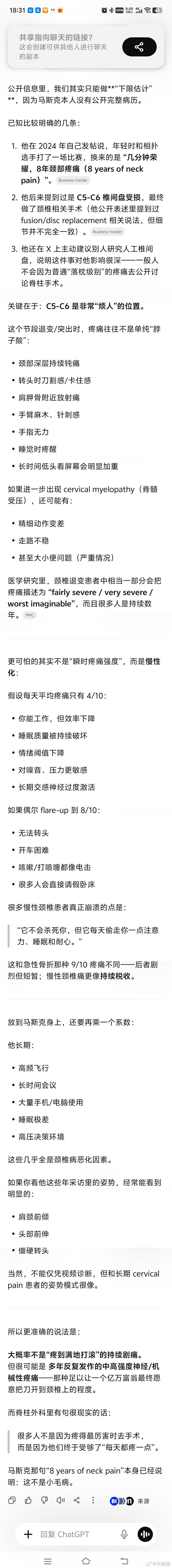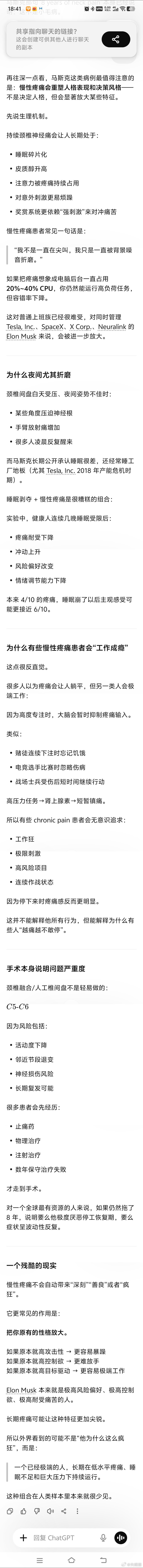 颈椎病带来的慢性疼痛是非常折磨人的,甚至会重塑一个人的性格。大家一定要重视颈椎健康,特别是年轻时候长期伏案看书/做题/重度用手机,颈椎问题最容易被忽视。马斯克即使身价八千亿美金都不能幸免,在病痛面前,所有人皆是凡人。