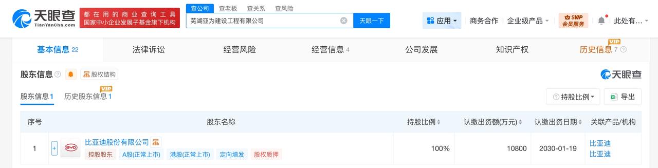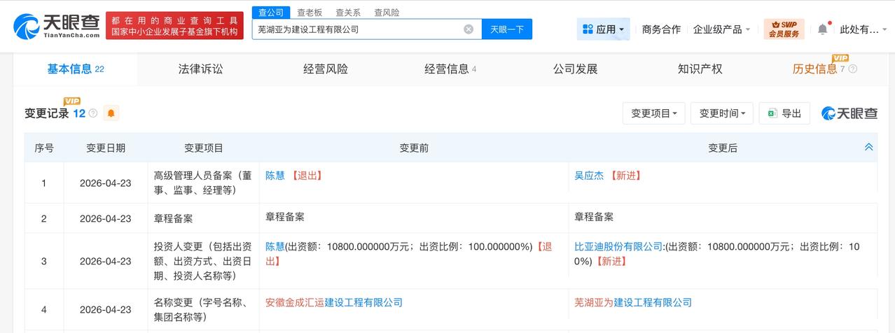 天眼查App显示,近日,安徽金成汇运建设工程有限公司发生工商变更,企业名称变更为芜湖亚为建设工程有限公司,原股东陈慧退出,新增比亚迪(002594)为股东并全资持股,同时,多位高管发生变更。